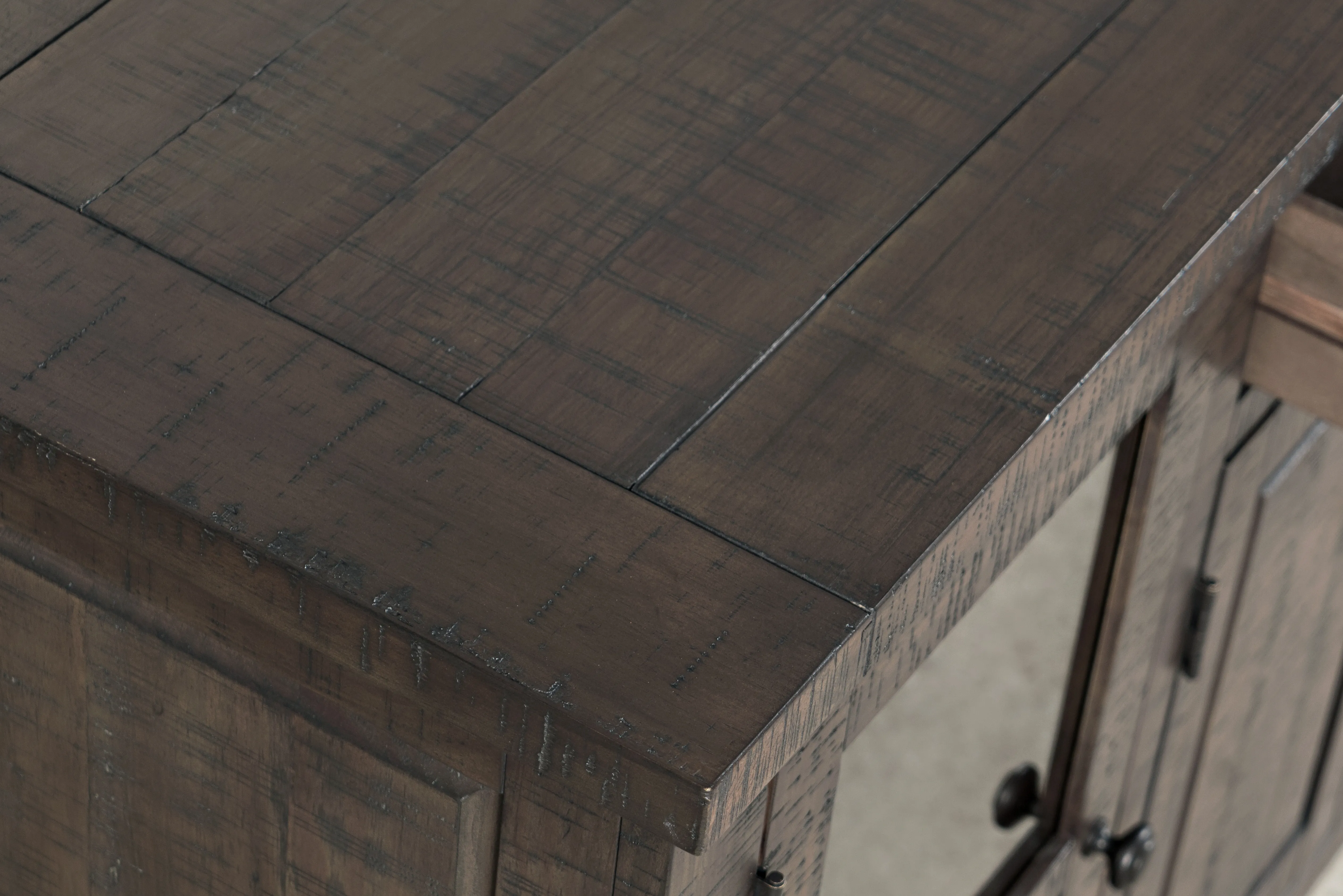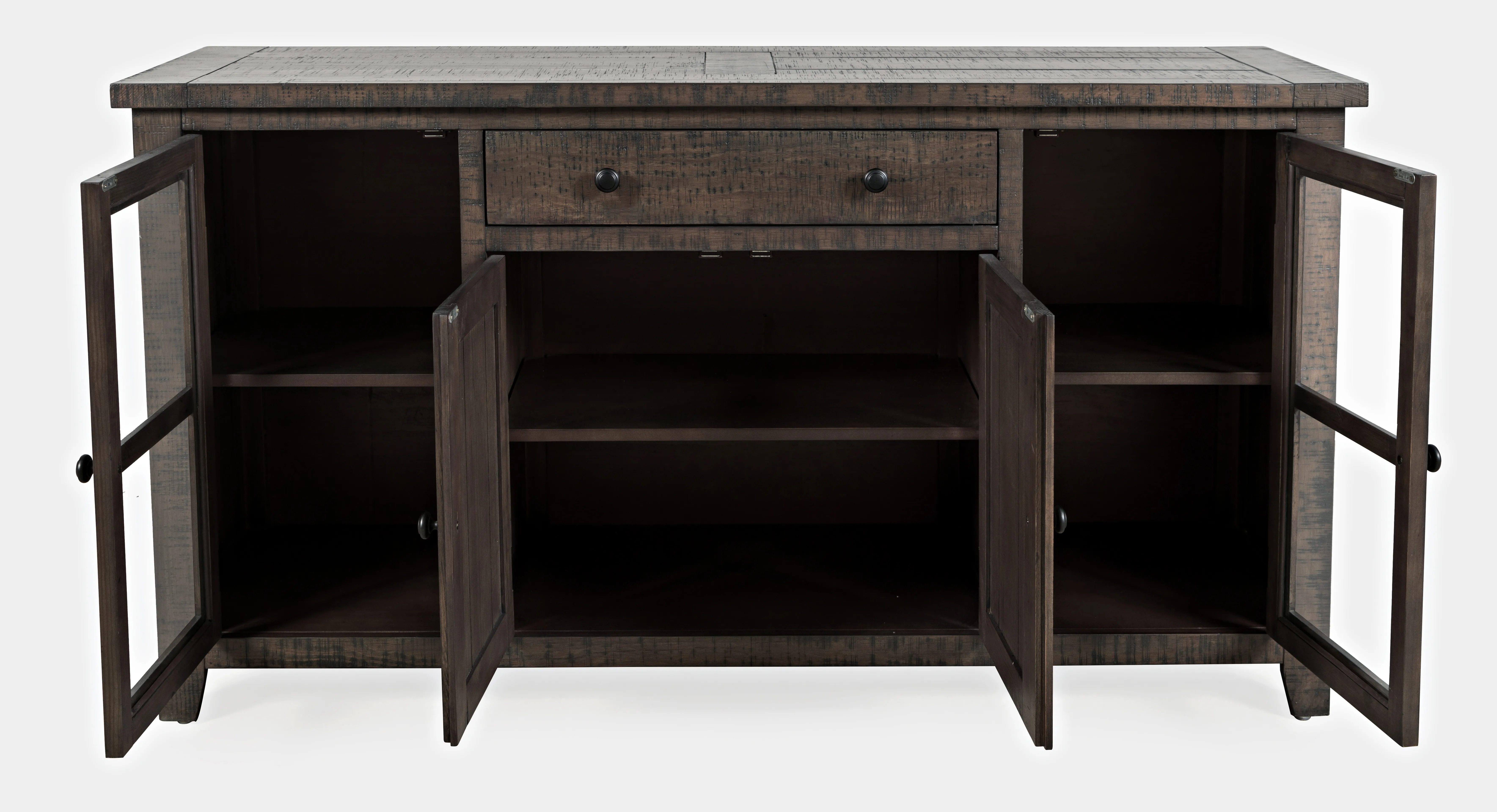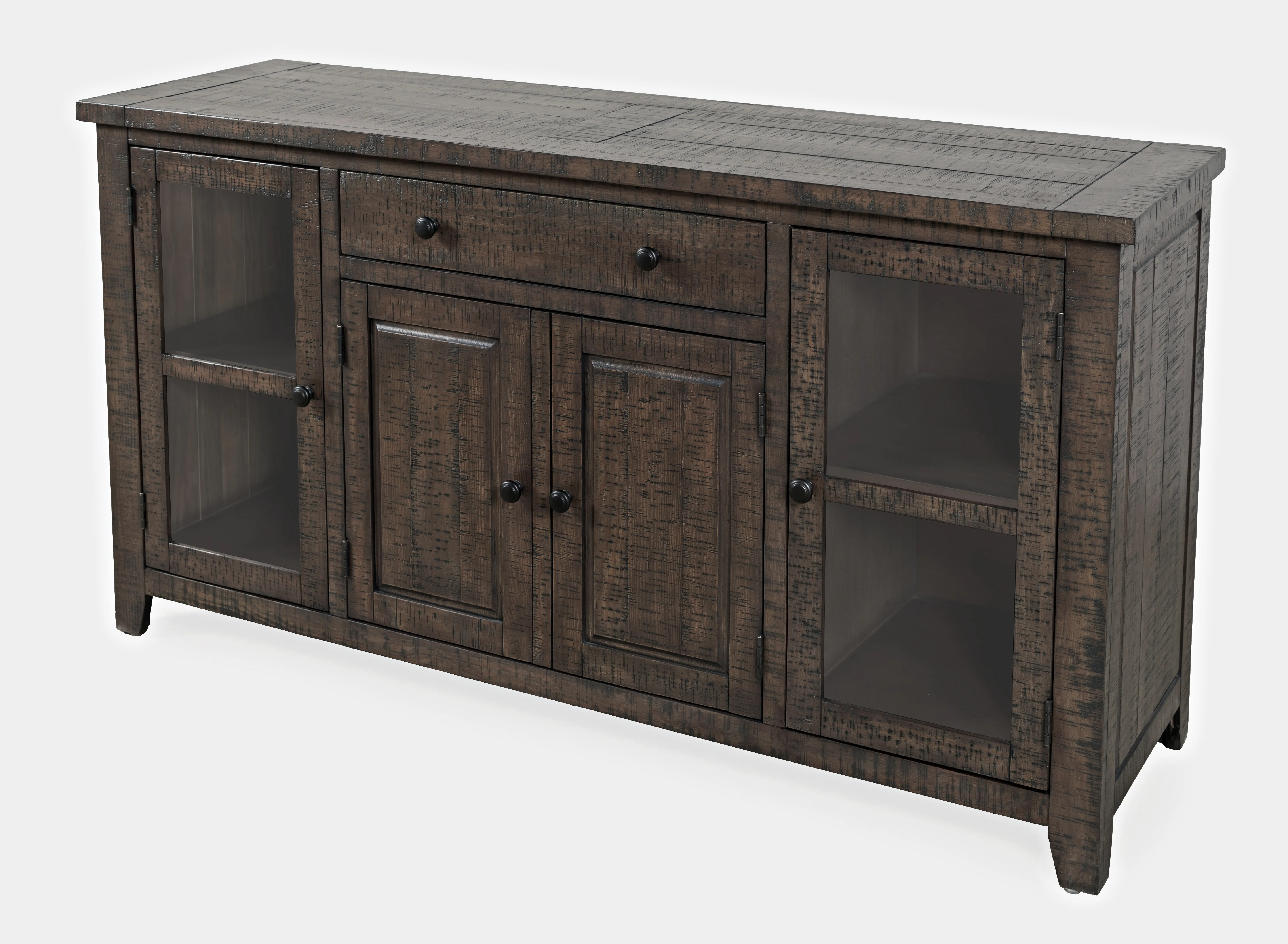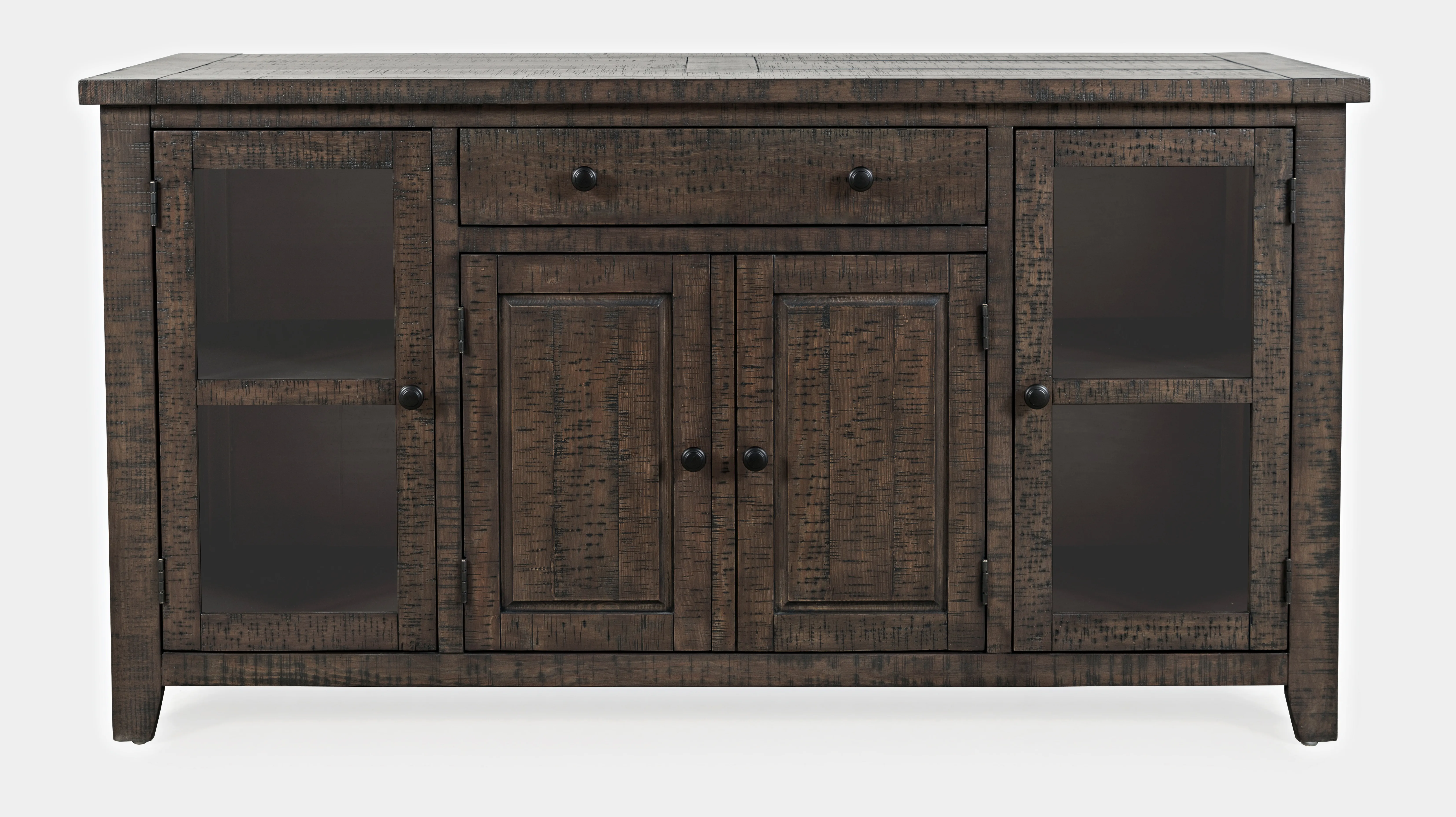 The Willow Creek collection blends the beauty of solid Pine with a rich distressed finish for a rustic style that is right at home. This classic sideboard buffet server pairs perfectly with the matching dining table, and the industrial hardware adds a wonderful sophisticated accent.