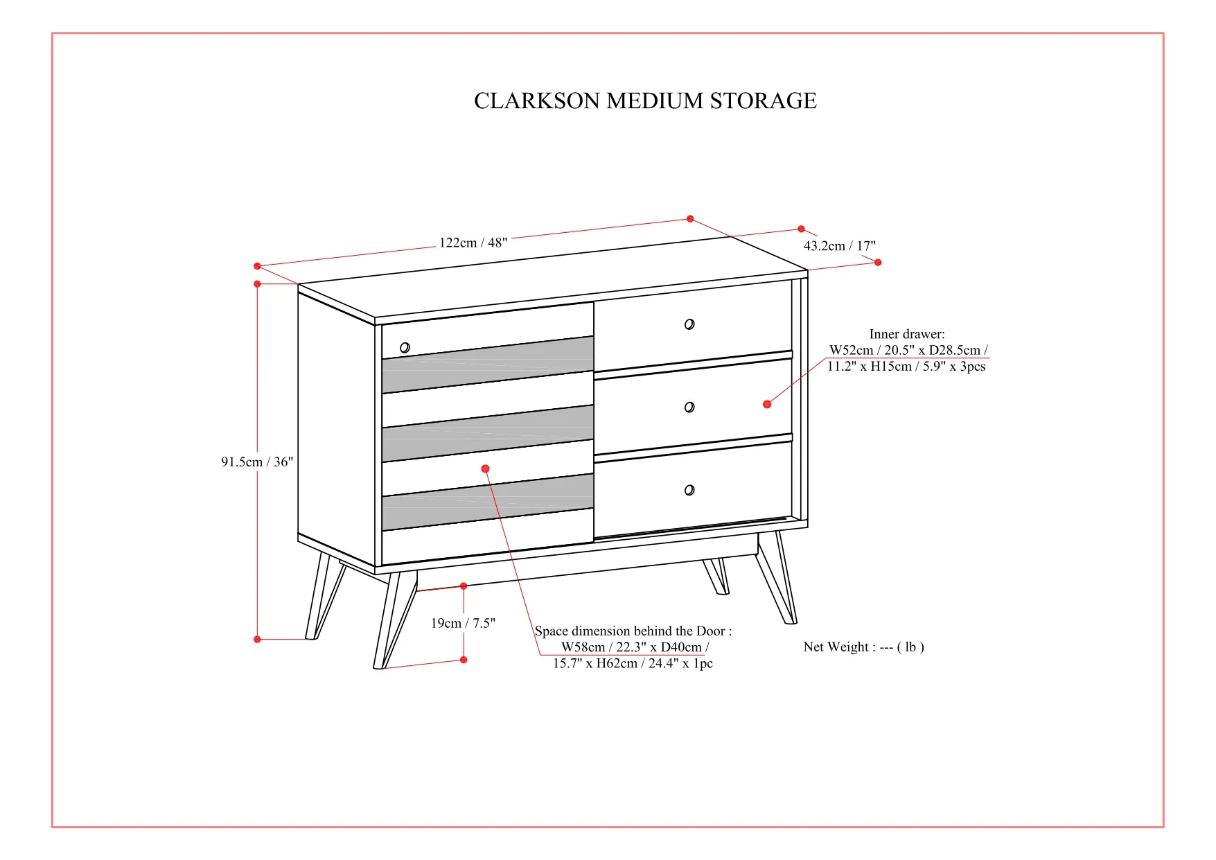 • Features three drawers with finger joints and metal drawer glides, one sliding door which opens to a large storage space with 2 adjustable shelves