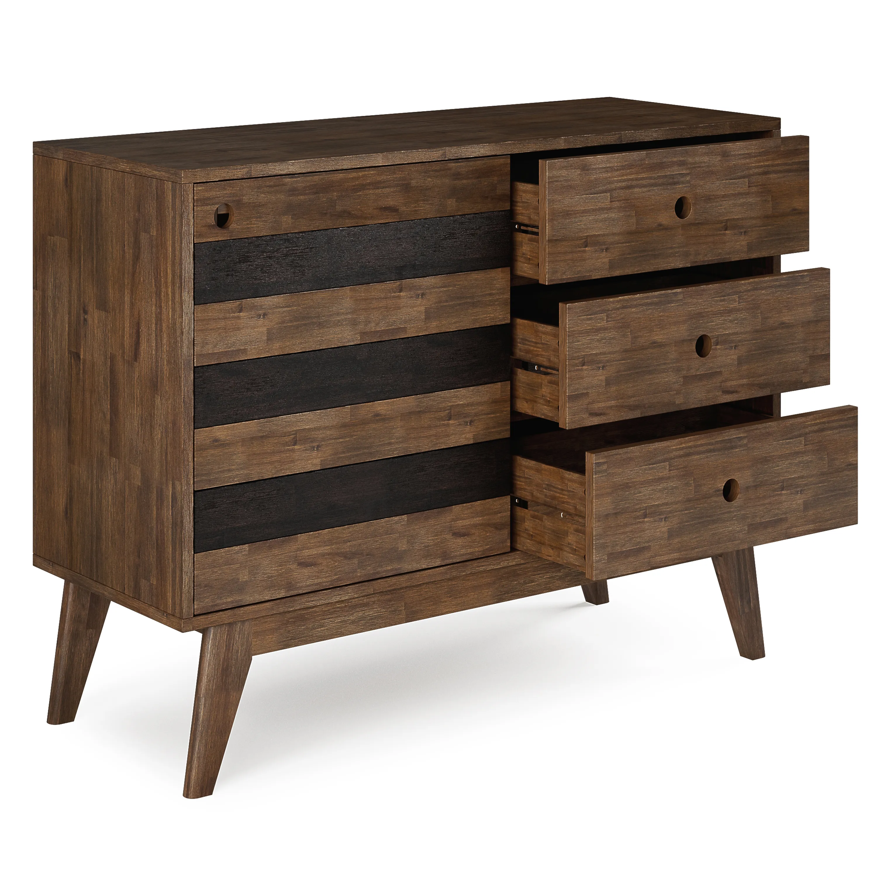 • Mid Century design includes dark brown accent detail and discreet cut out door and drawer handles