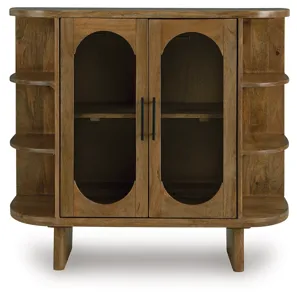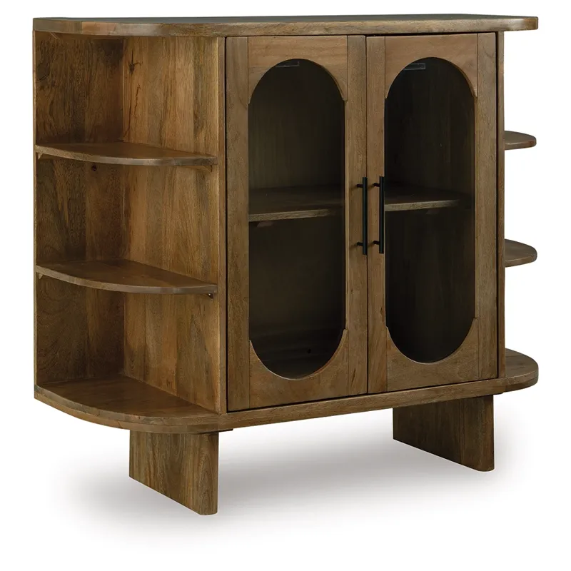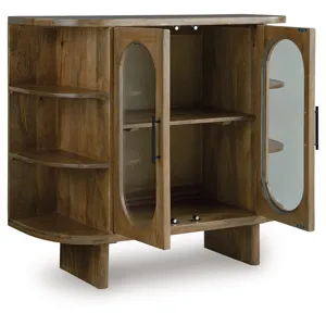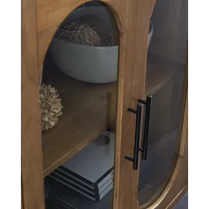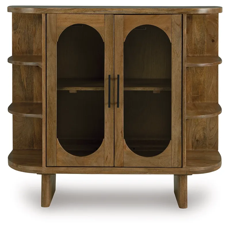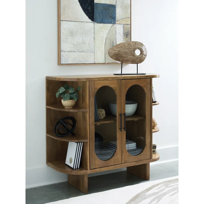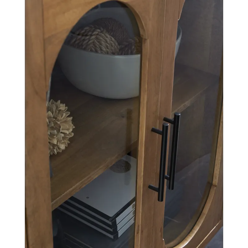 This accent cabinet puts a uniquely chic spin on a classic storage solution. It seamlessly blends clean lines with mid-century inspired curves, donning a light brown finish for that much more versatility. Exposed side shelves eagerly welcome your favorite decorative pieces, while additional shelves behind the glass-paneled doors offer ample storage.