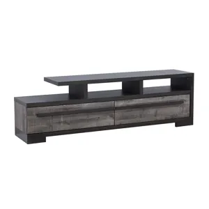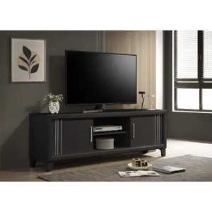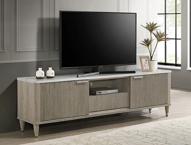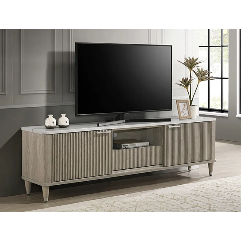 This entertainment console radiates modern sophistication with its organic, neutral finish and distinctive vertical ribbed design. Crafted from high-quality materials, it offers ample storage with sliding doors and open shelving, perfect for organizing media devices and accessories. The elegant tapered legs add a touch of mid-century flair, while the spacious faux marble top provides a stylish surface for your entertainment essentials. Combining functionality with contemporary style, this piece transforms your living room into a sophisticated hub of relaxation and entertainment.