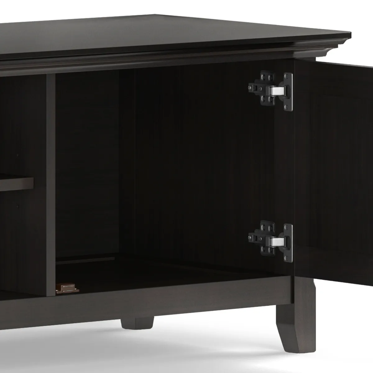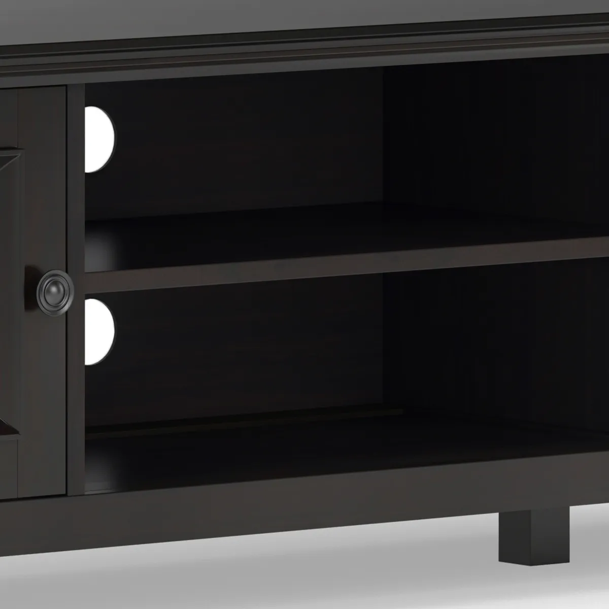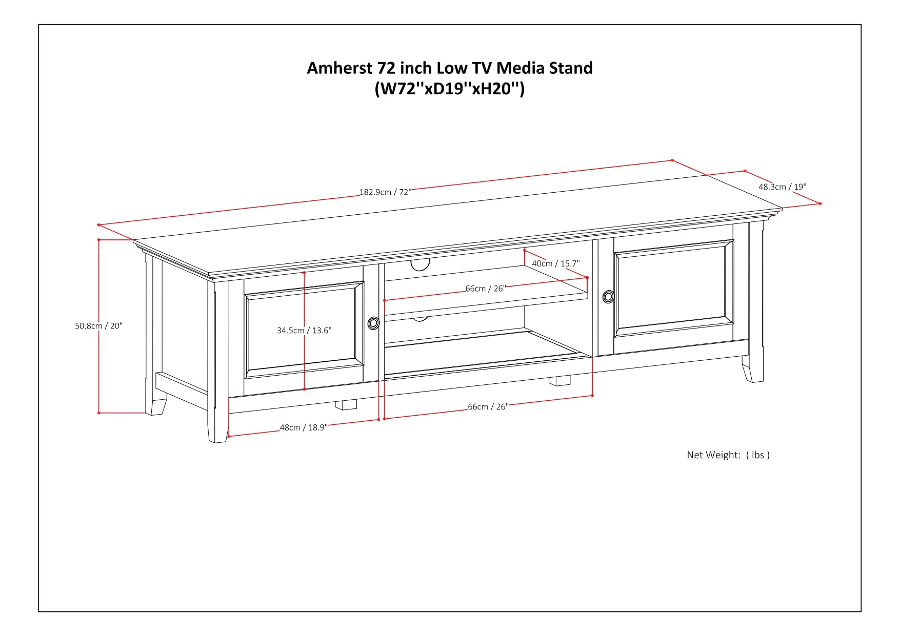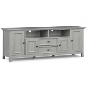 Having just purchased your dream large flat screen TV - you need the perfect TV Stand to enhance your viewing pleasure. Look no further. The Amherst 72 in Low TV Stand is perfectly sized for TV's up to 80 inches. The 20 inch height puts the TV at a level that is ideal for comfortable viewing. The Amherst 72 in Low TV Stand has plenty of storage and space for all your media and gaming devices. It has a large centrally located open area with one adjustable shelf and two large side storage cabinets . The unit features cord management cut-outs for easy installation of TV and media components.