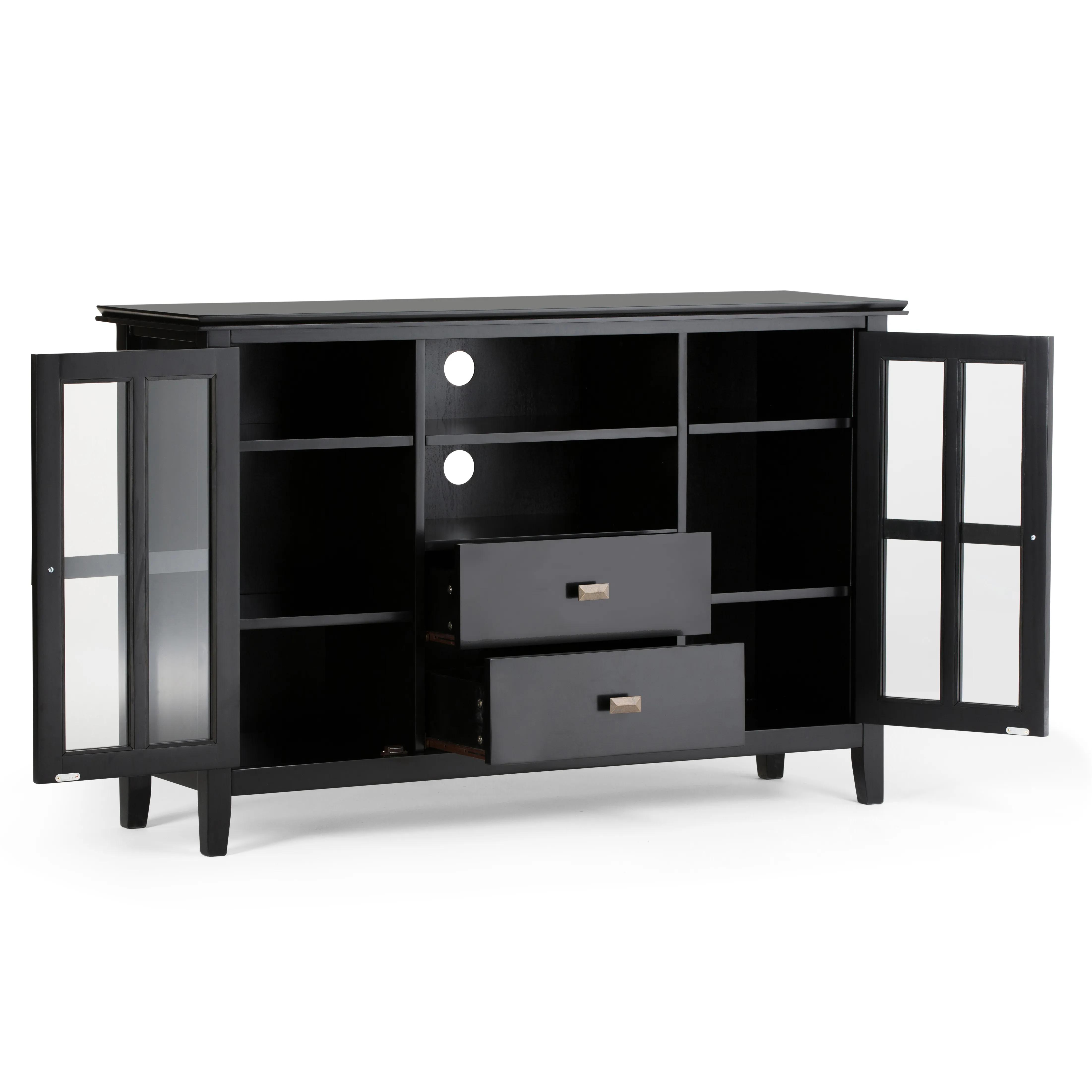 You just bought the ultimate large flat screen TV. Now what to do? Hang it on the wall? No, you need the perfect TV Stand for storage and to enhance your viewing pleasure. Look no further than our most popular Artisan TV Stand. It is perfectly sized for TVs up to 60 inches. The 35 inch height puts the TV at a level that is ideal for comfortable viewing. The Artisan TV Stand has plenty of storage and space for all your media and gaming devices. It has a large centrally located open area with one adjustable shelf and two drawers. The two large side storage cabinets open to two adjustable shelves. The unit features cord management cut-outs for easy installation of TV and media components.