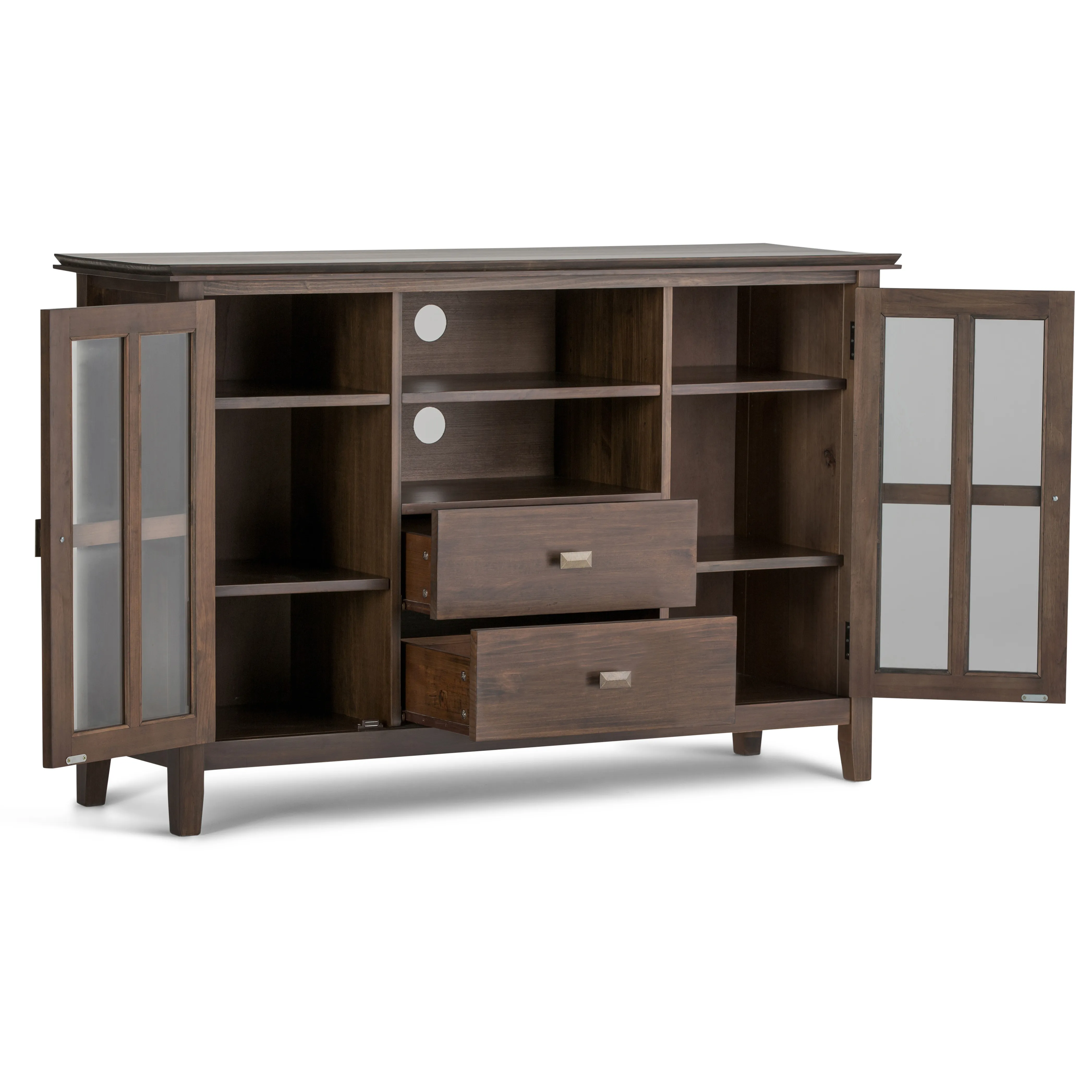 You just bought the ultimate large flat screen TV. Now what to do? Hang it on the wall? No, you need the perfect TV Stand for storage and to enhance your viewing pleasure. Look no further than our most popular Artisan TV Stand. It is perfectly sized for TVs up to 60 inches. The 35 inch height puts the TV at a level that is ideal for comfortable viewing. The Artisan TV Stand has plenty of storage and space for all your media and gaming devices. It has a large centrally located open area with one adjustable shelf and two drawers. The two large side storage cabinets open to two adjustable shelves. The unit features cord management cut-outs for easy installation of TV and media components.
