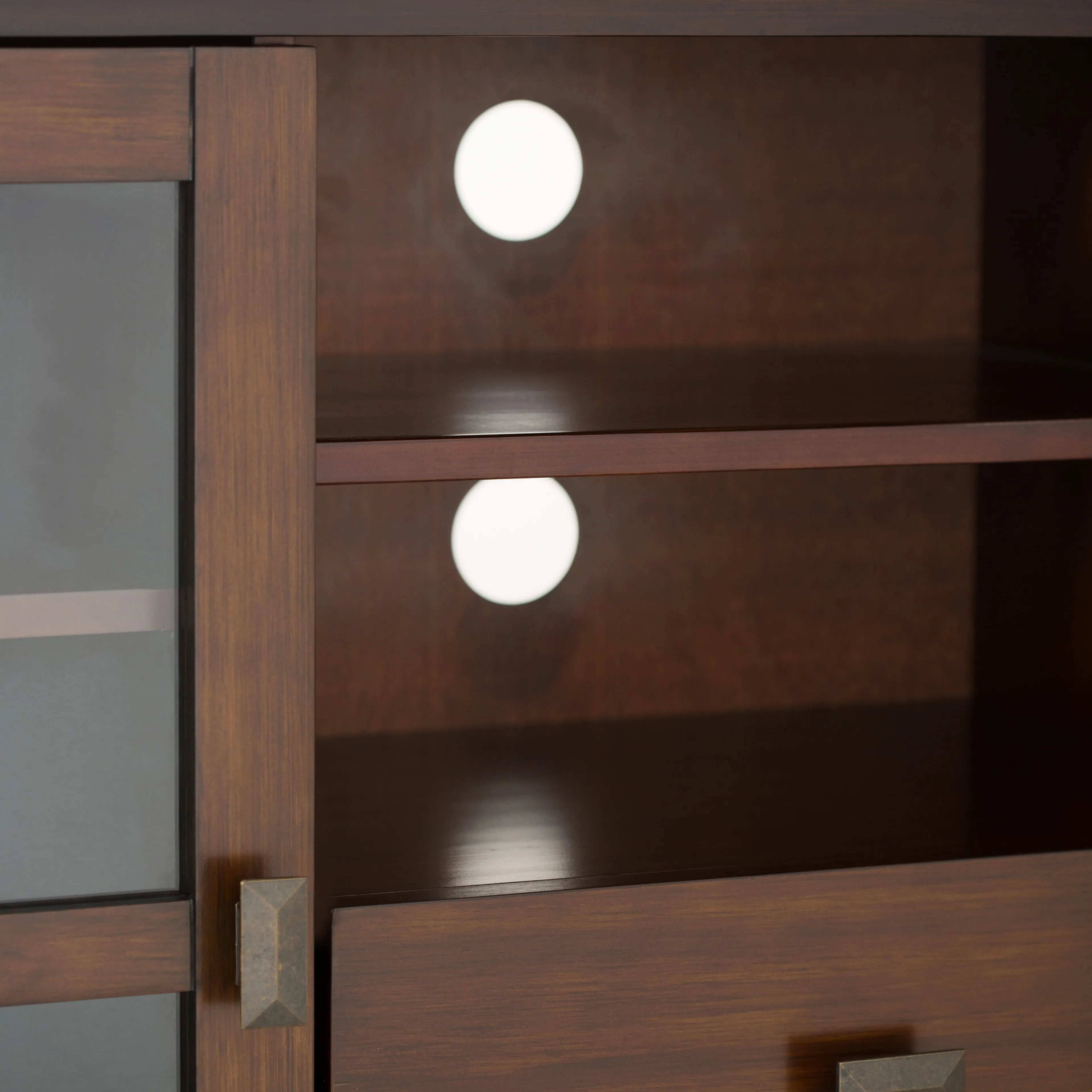 You just bought the ultimate large flat screen TV. Now what to do? Hang it on the wall? No, you need the perfect TV Stand for storage and to enhance your viewing pleasure. Look no further than our most popular Artisan TV Stand. It is perfectly sized for TVs up to 60 inches. The 35 inch height puts the TV at a level that is ideal for comfortable viewing. The Artisan TV Stand has plenty of storage and space for all your media and gaming devices. It has a large centrally located open area with one adjustable shelf and two drawers. The two large side storage cabinets open to two adjustable shelves. The unit features cord management cut-outs for easy installation of TV and media components.