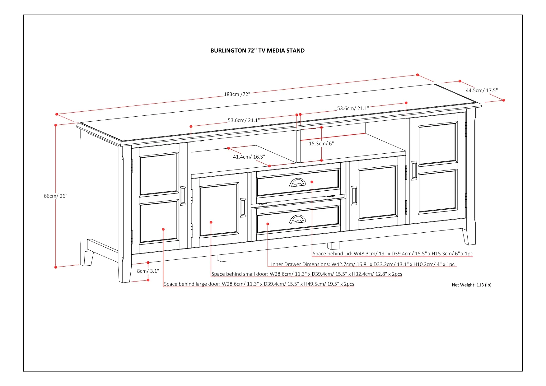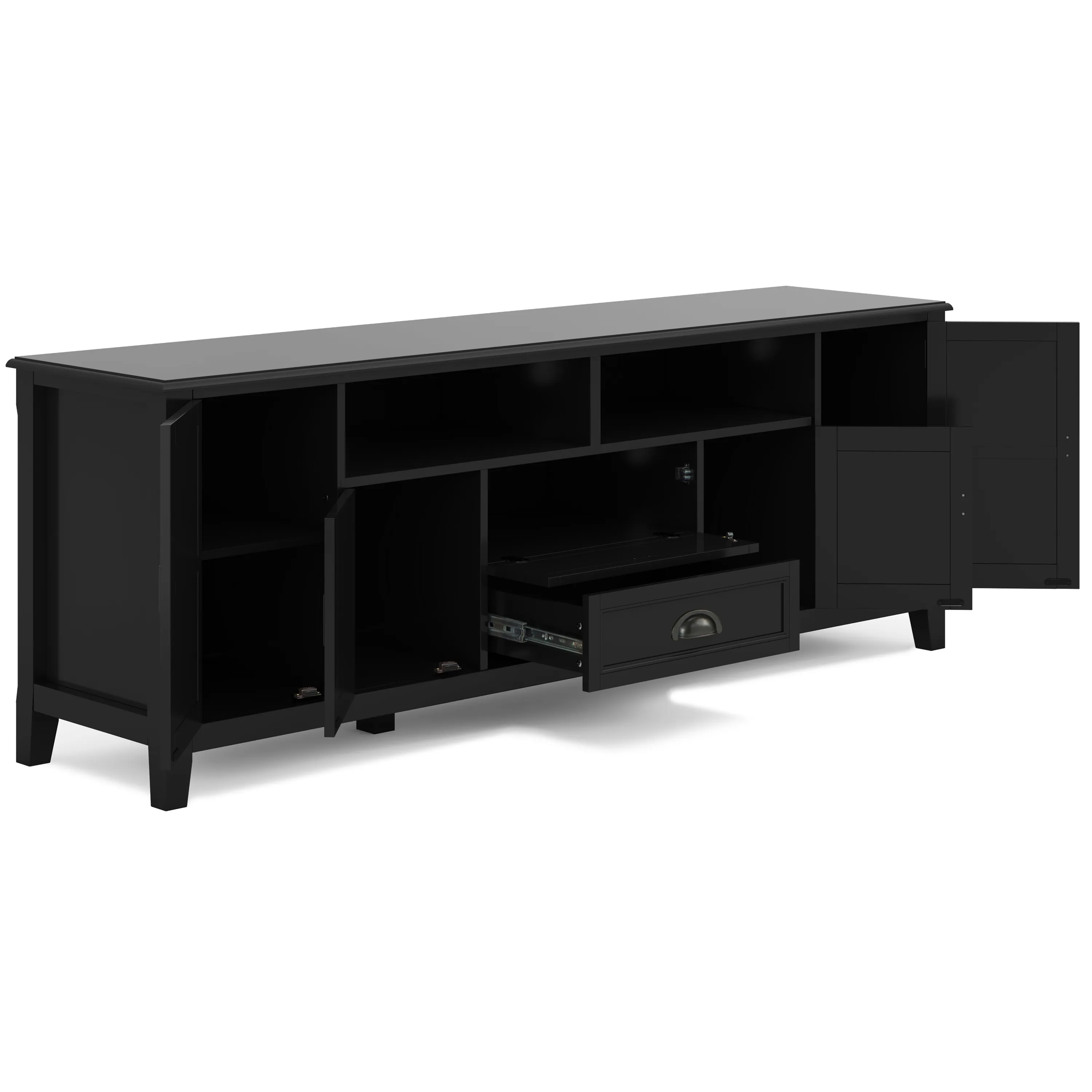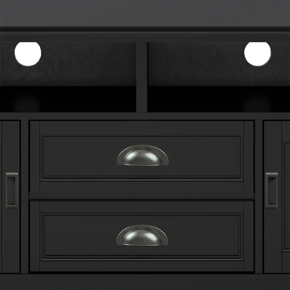 Now that 72 inch flat screen TVs are more affordable, you need to have one. To enjoy it fully, you will also need the perfect TV Stand to position your TV just right. Look no further. The Burlington 72 inch wide TV Stand is perfectly sized for TV's up to 80 inches. It has plenty of storage space for all your media and gaming devices. It has a two centrally located open areas with two drawers as well as two enclosed spaces. The two large side storage cabinets open to one adjustable shelf each. The unit features cord management cut-outs for easy installation of TV and media components.