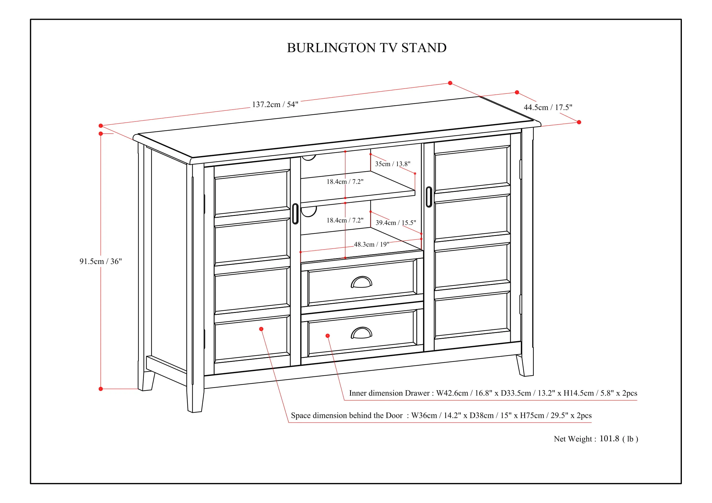 You just bought the ultimate large flat screen TV. Now what to do? Hang it on the wall? No, you need the perfect TV Stand for storage and to enhance your viewing pleasure. Look no further than our popular Burlington TV Stand. It is perfectly sized for TV's up to 60 inches and its 36 inch height puts the TV at a level that is ideal for comfortable viewing. The Burlington TV Stand has plenty of storage and space for all your media and gaming devices. It has a large centrally located open area with one adjustable shelf and two drawers. The two large side storage cabinets open to two adjustable shelves. The unit features cord management cut-outs for easy installation of TV and media components.