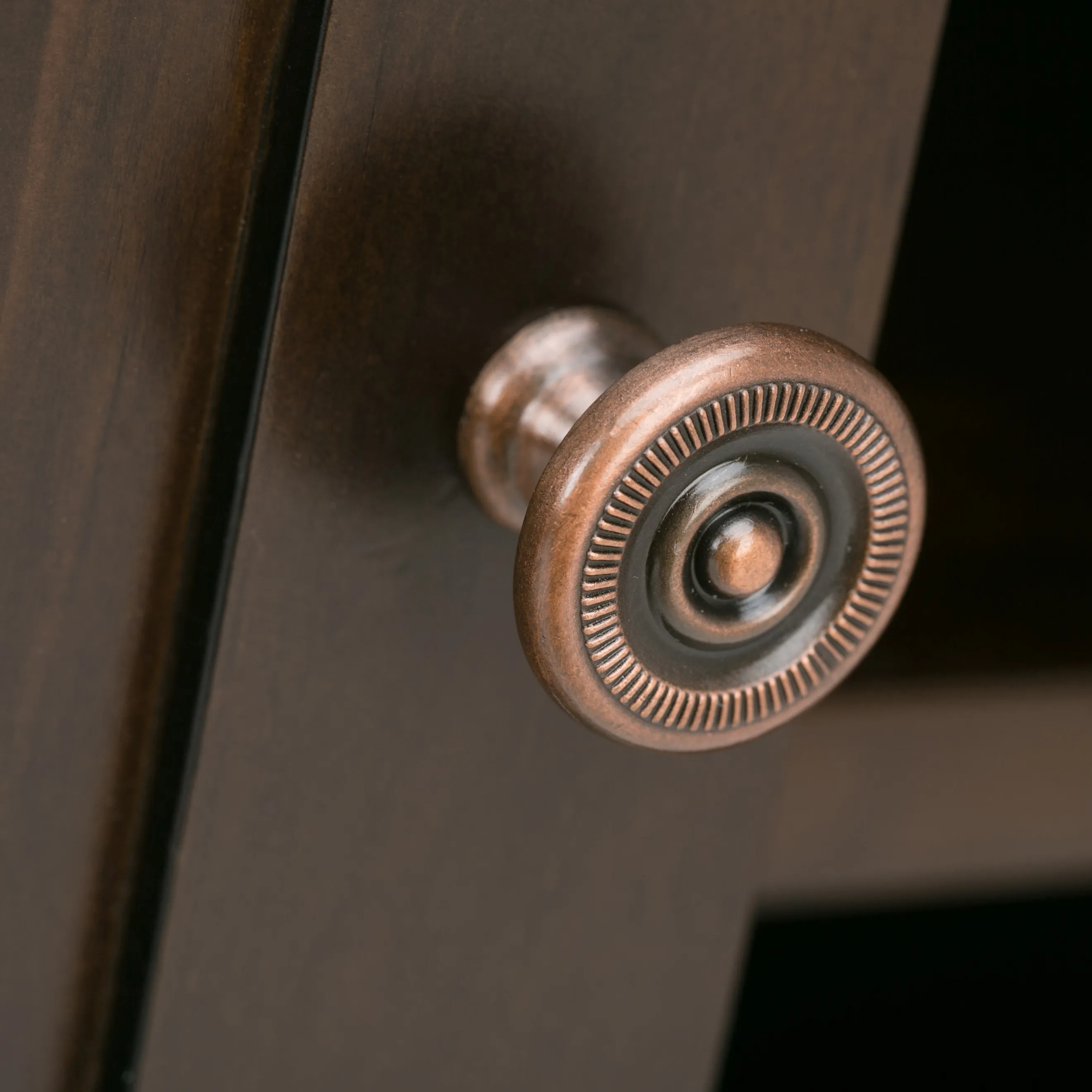 • Transitional design includes defined double molded top, tapered table legs, Bronze rounded decorative knobs and shaker style doors