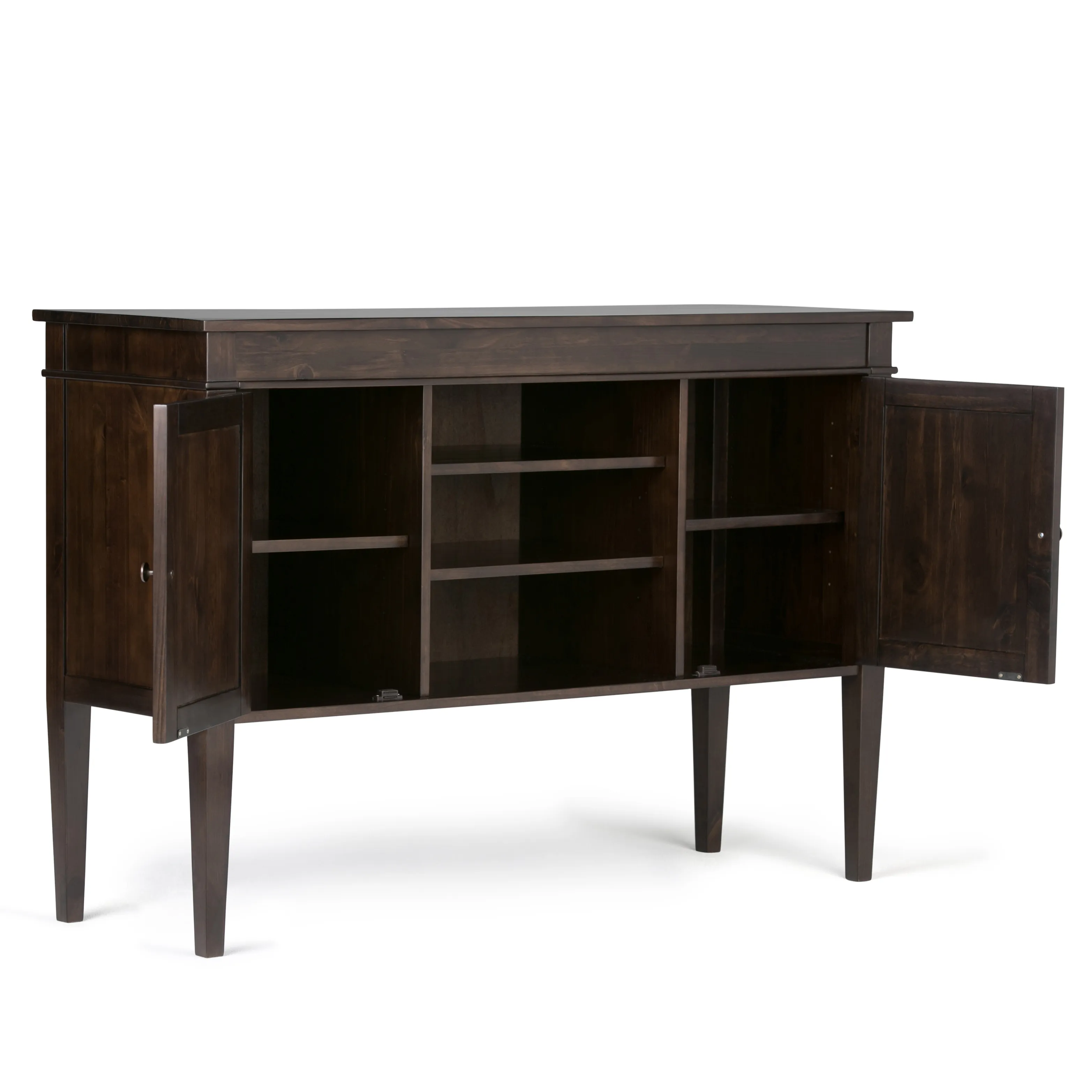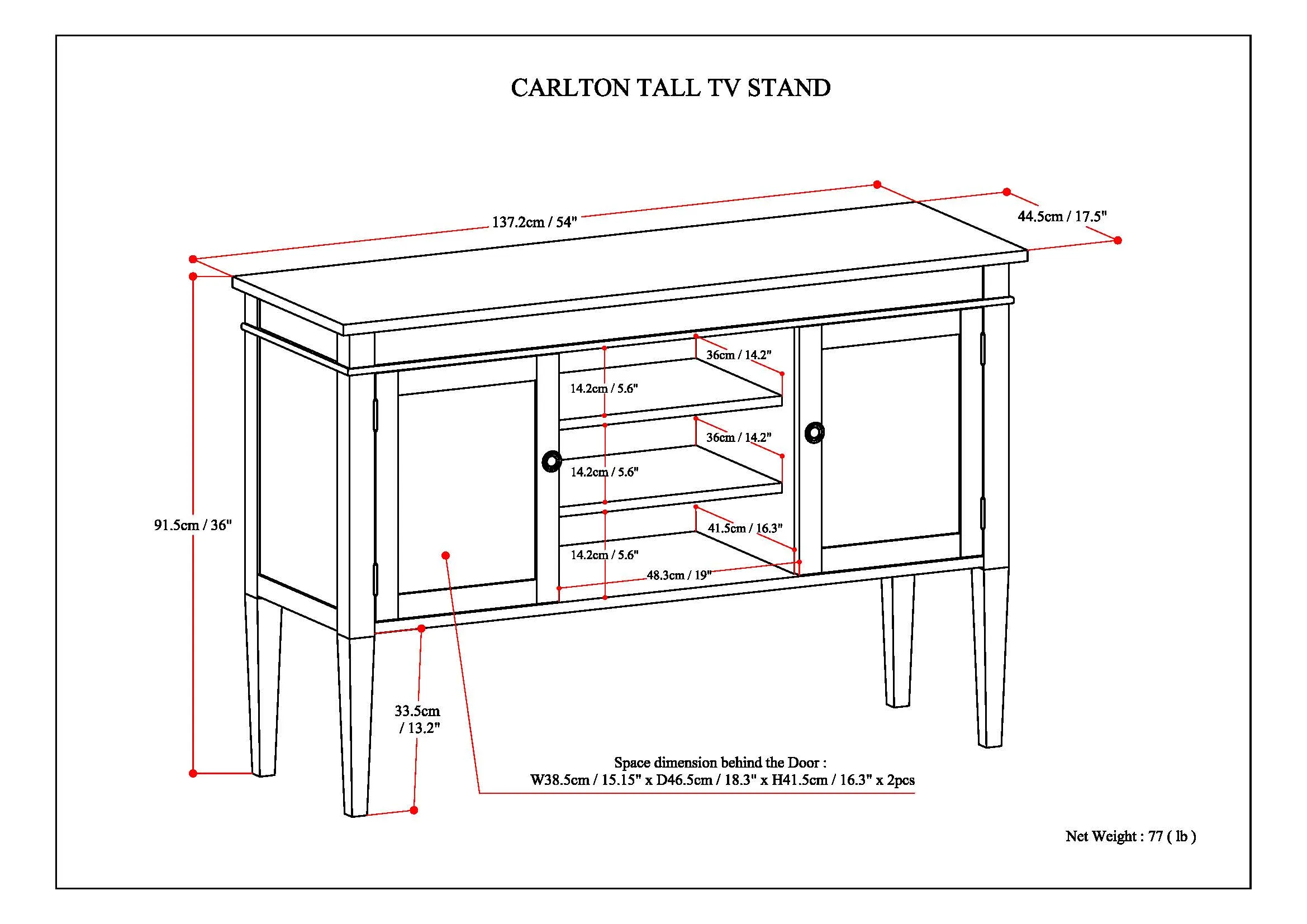 Having just purchased your dream large flat screen TV - you need the perfect TV Stand to enhance your viewing pleasure. Look no further. The Carlton TV Stand is perfectly sized for TVs up to 60 inches. The 36 inch height puts the TV at a level that is ideal for comfortable viewing. The Carlton TV Stand has plenty of storage and space for all your media and gaming devices. It has a large centrally located open area with two adjustable shelves. The two large side storage cabinets open to one adjustable shelf. The unit features cord management cut-outs for easy installation of TV and media components.