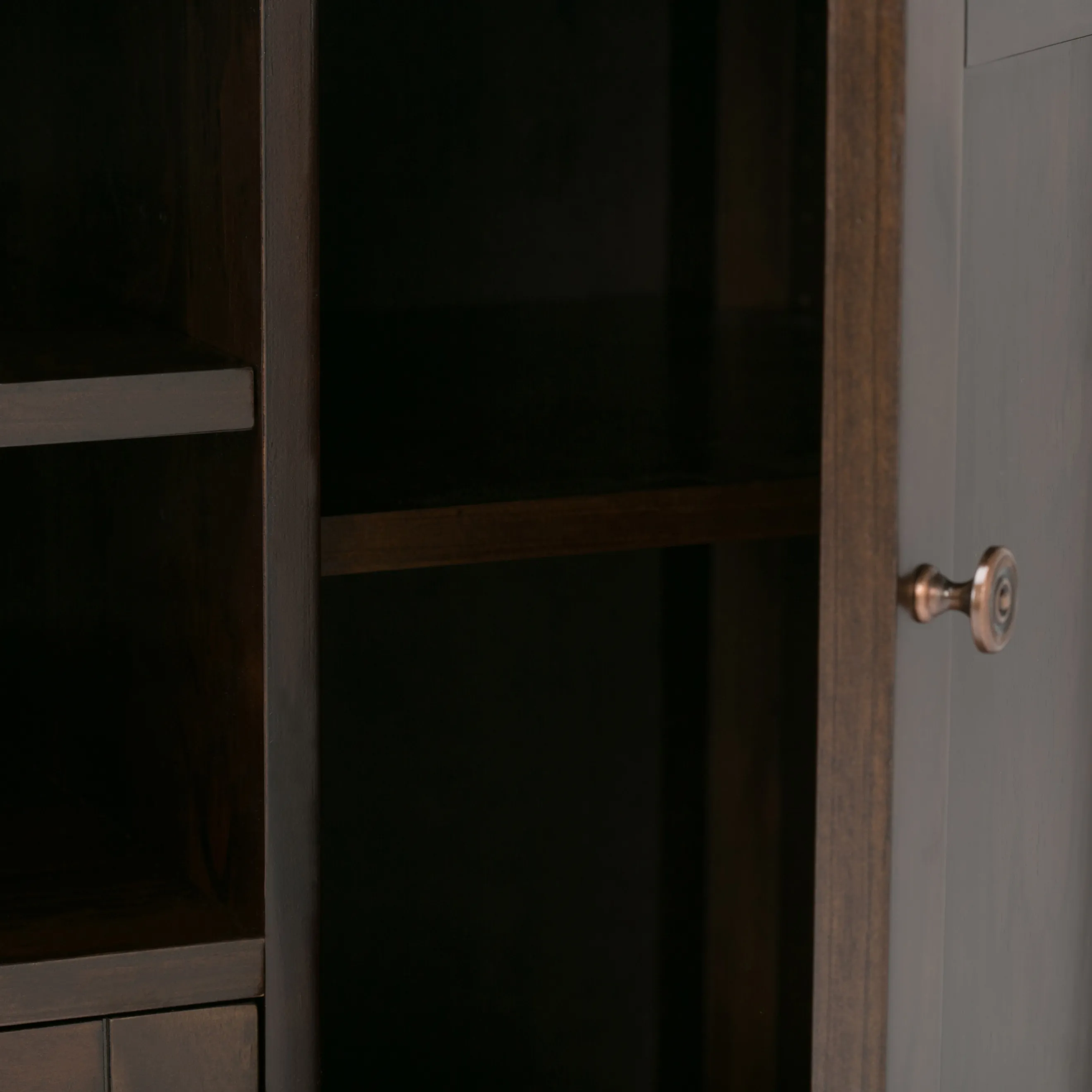 • Features two (2) central doors for cubby storage, open center area with adjustable shelf and two (2) side doors that open to large storage spaces with two (2) shelves each