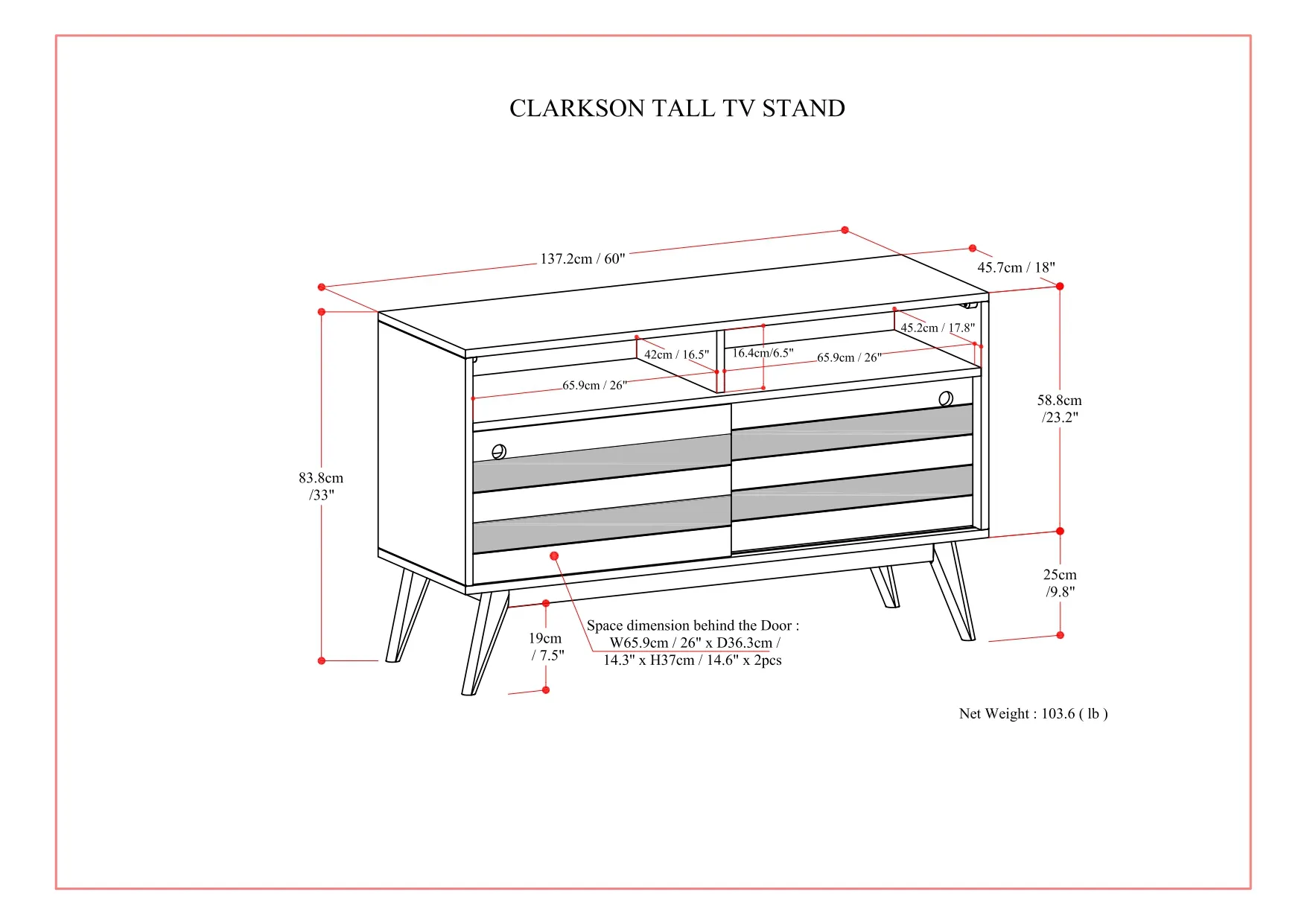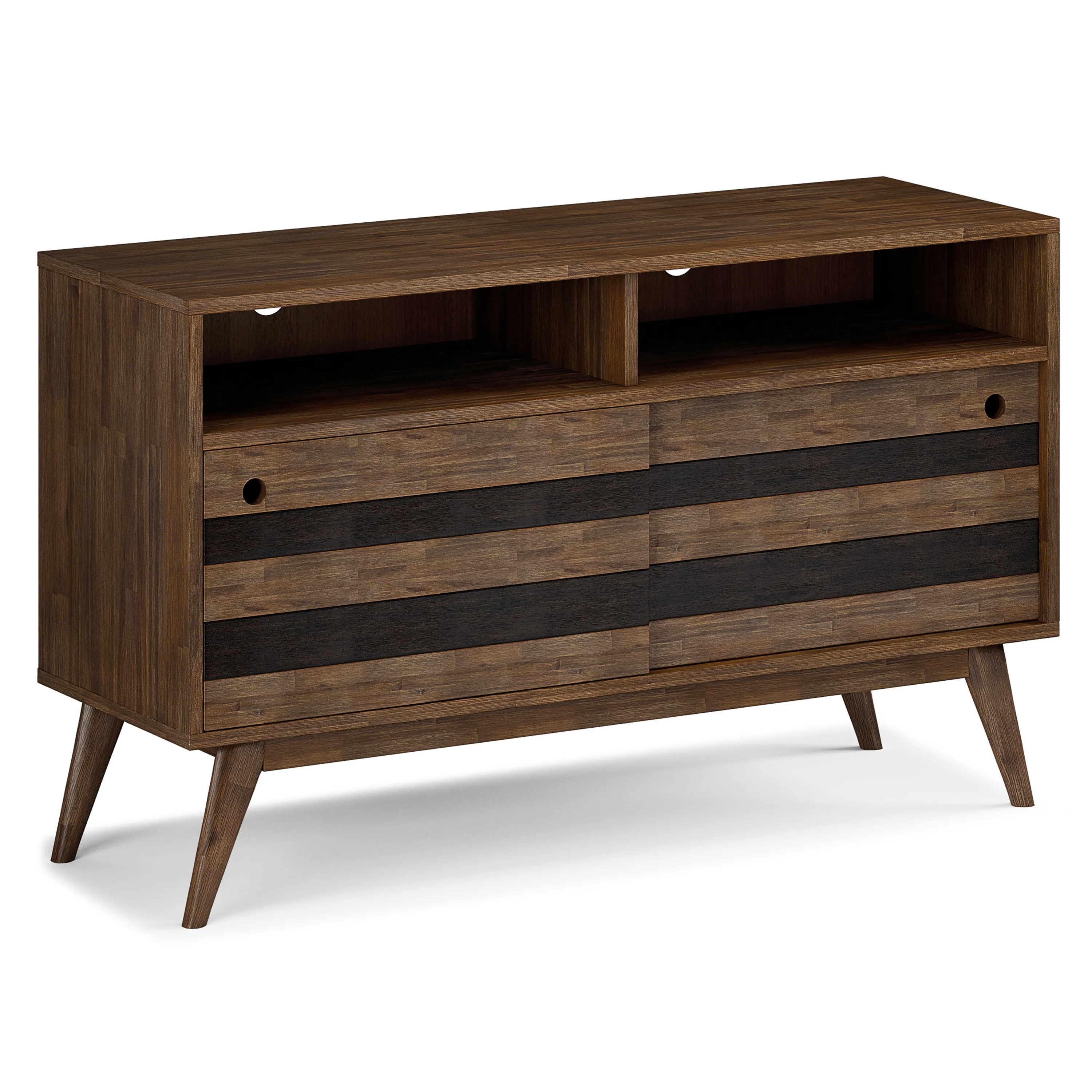 Your TV deserves a stylish and sturdy stand. The Clarkson Tall TV Media Stand is a well-designed and can accommodate a TV up to 60”. Crafted of solid Acacia with a Rustic Natural Aged Brown finish with a dark brown accent detail. The TV stand features two open compartments with cable management cutouts for your electronics. Two lower cabinets each have one adjustable shelf, perfect for storing everything from books to remotes and games. The Clarkson Tall TV Media Stand will blend effortlessly into any living and family room settings.