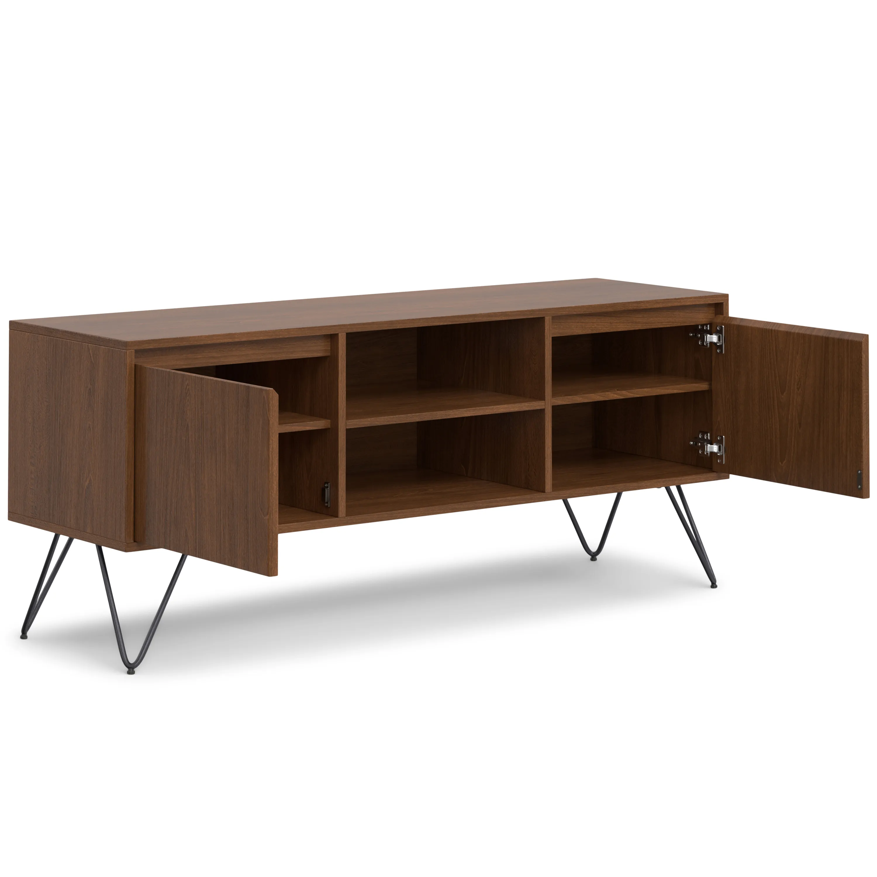 Clean-lined design meets industrial chic with the Hunter 60” TV Media Stand. Hand crafted with a combination of solid Mango Wood and sturdy metal hairpin legs. The open shelving and hidden storage compartments make it easy to stay organized and wire free. Ideal for storing DVD favorites and media accessories. Perfect for TV’s up to 65 inches this media unit brings function and style to any den or living room.