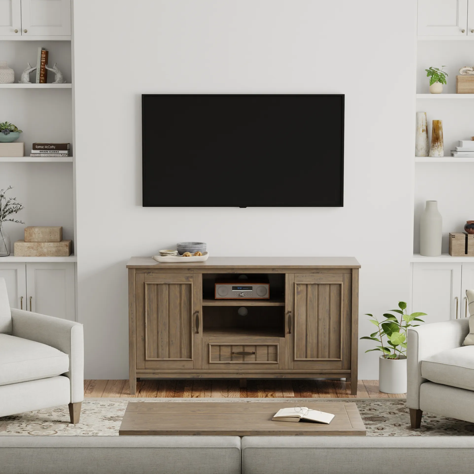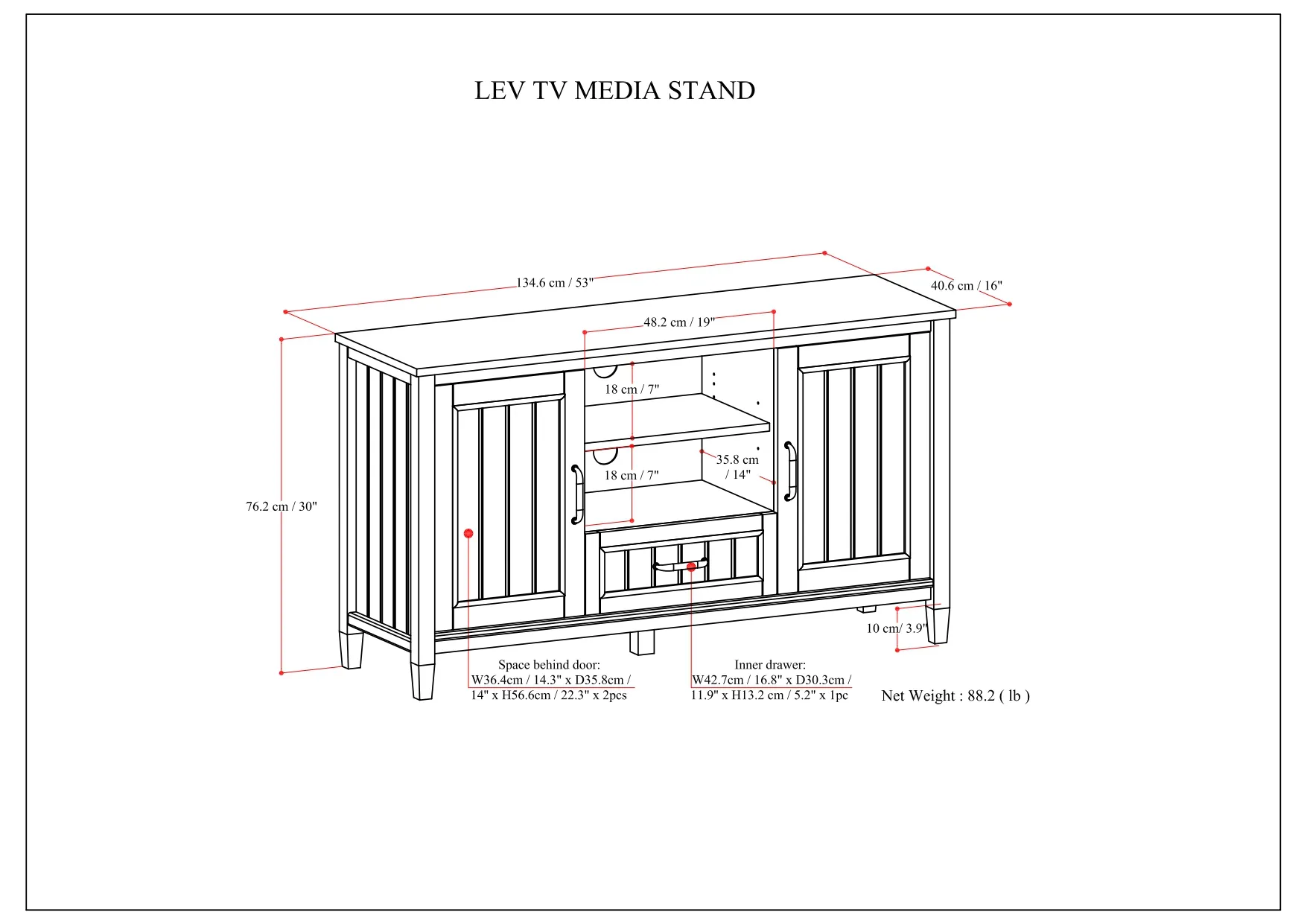 Having just purchased your dream large flat screen TV - you need the perfect TV Stand to enhance your viewing pleasure. Look no further. The Lev TV Stand is perfectly sized for TVs up to 60 inches. The 30-inch height puts the TV at a level that is ideal for comfortable viewing. The Lev TV Stand has plenty of storage and space for all your media and gaming devices. It has a large centrally located open area with an adjustable shelf and a bottom drawer. The two side storage cabinets open to one adjustable shelf. The unit features cord management cut-outs for easy installation of TV and media components.