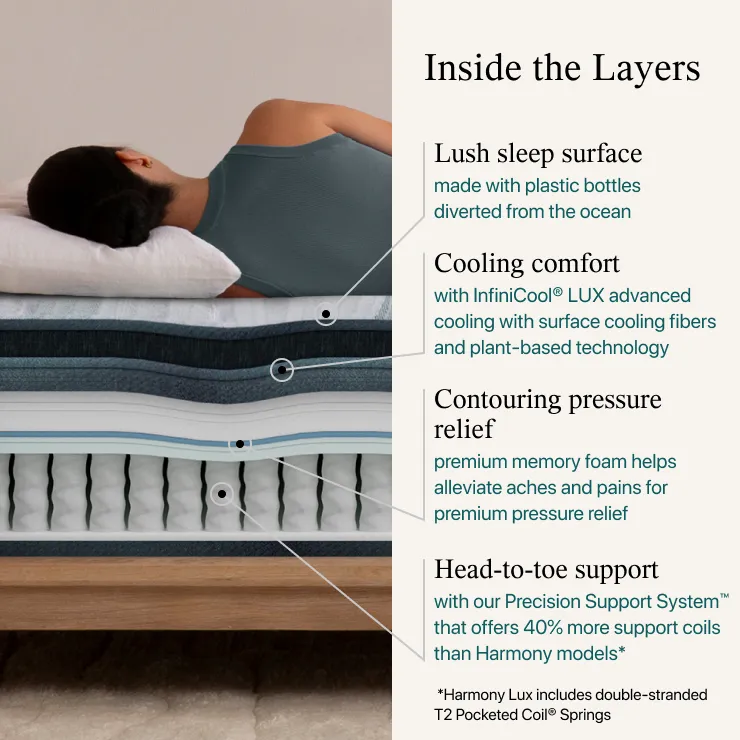 With 40% more support coils than Harmony models, advanced cooling features, consistent support, and a lofty quilted top, Harmony Lux supports more than just your body with a lush, sustainable sleep surface made with plastic bottles diverted from the ocean.