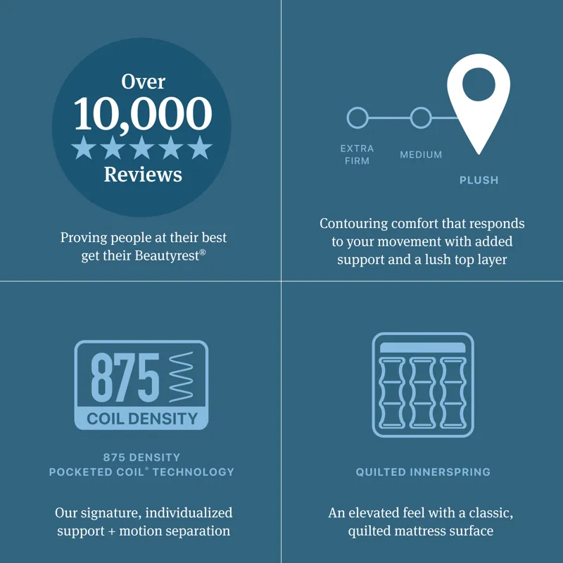 Discover the difference between sleep and Beautyrest® with our signature individualized support + motion separation, contouring pressure relief, and a classic, quilted surface.