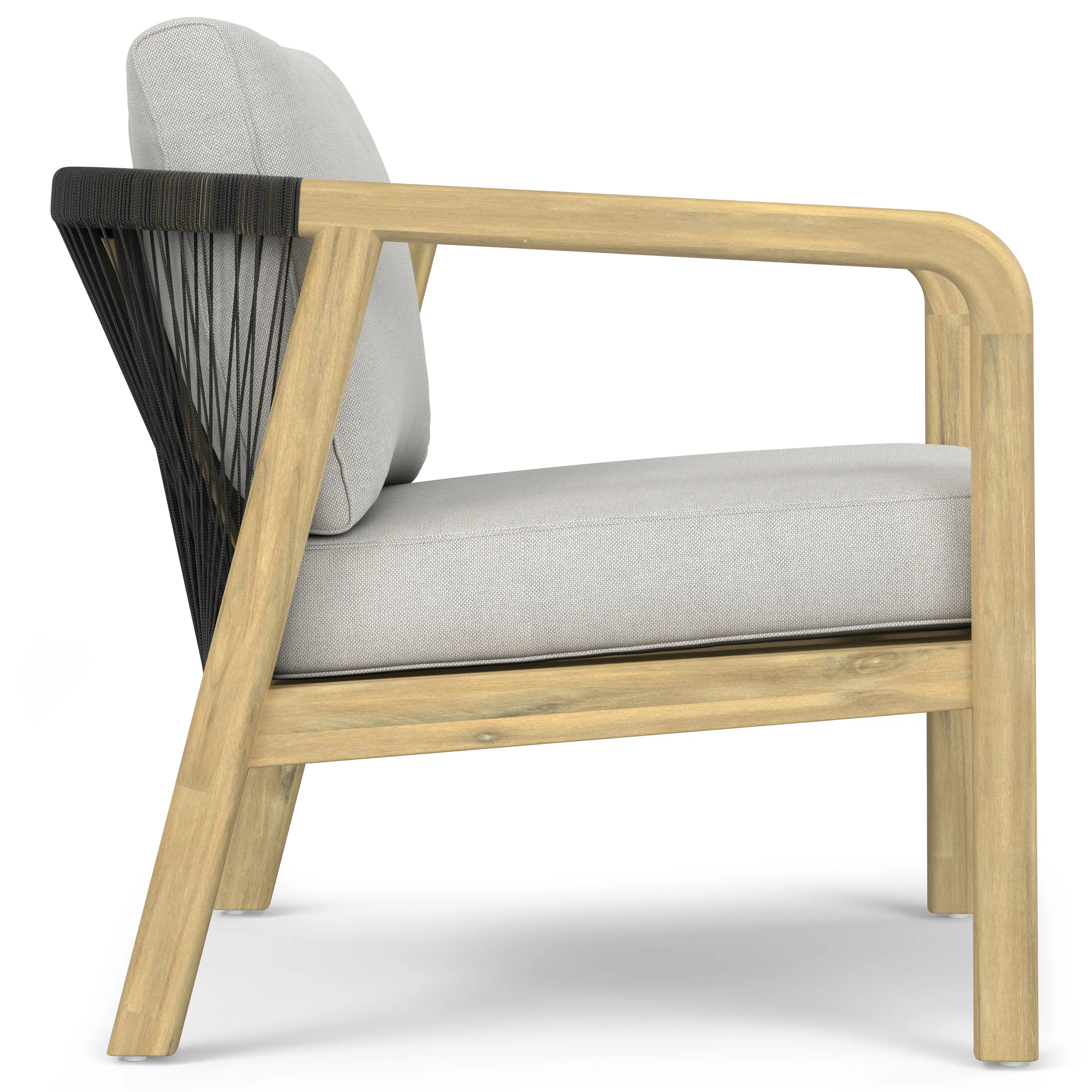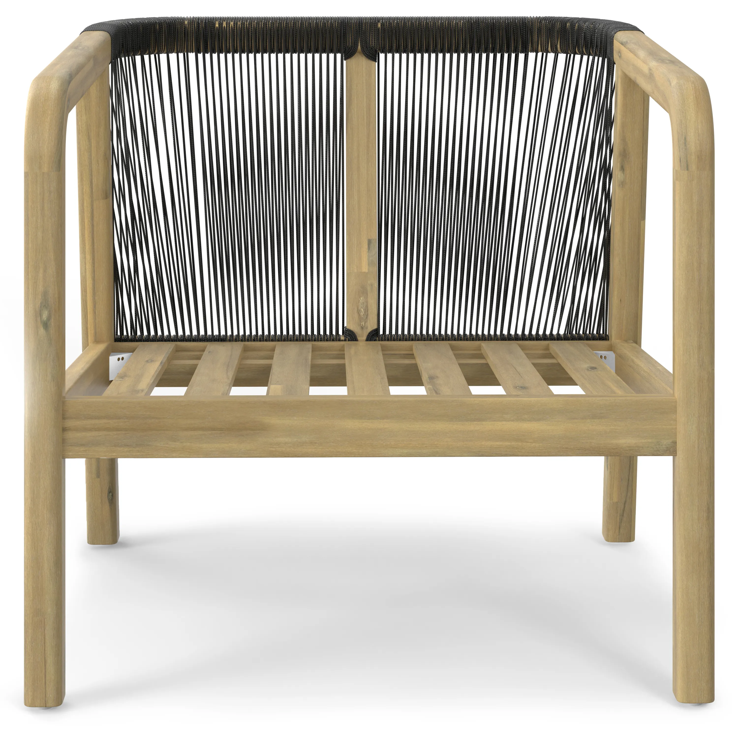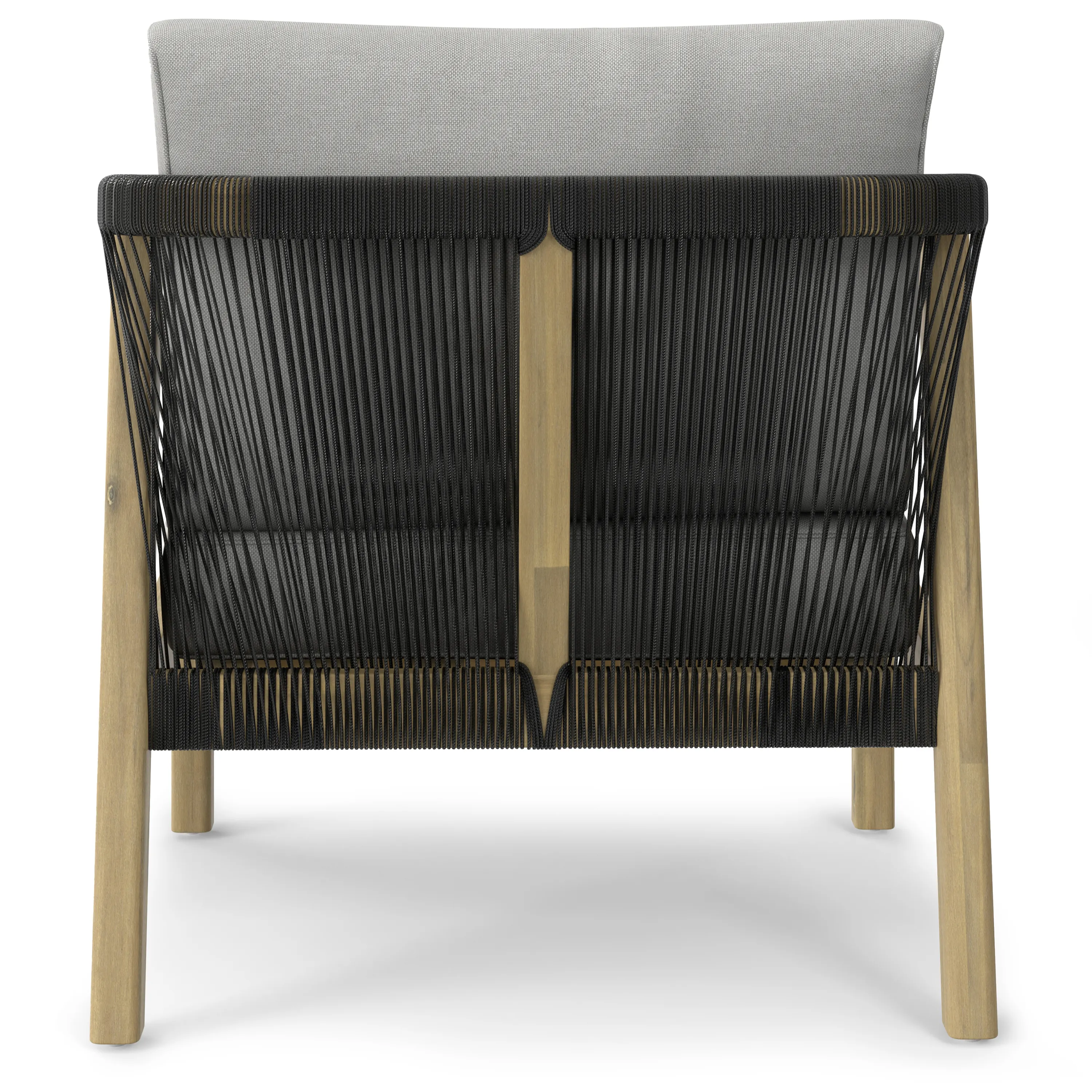 • Features a unique design, the solid acacia frame on the seat back is hand wrapped with highly durable woven grey rope cording