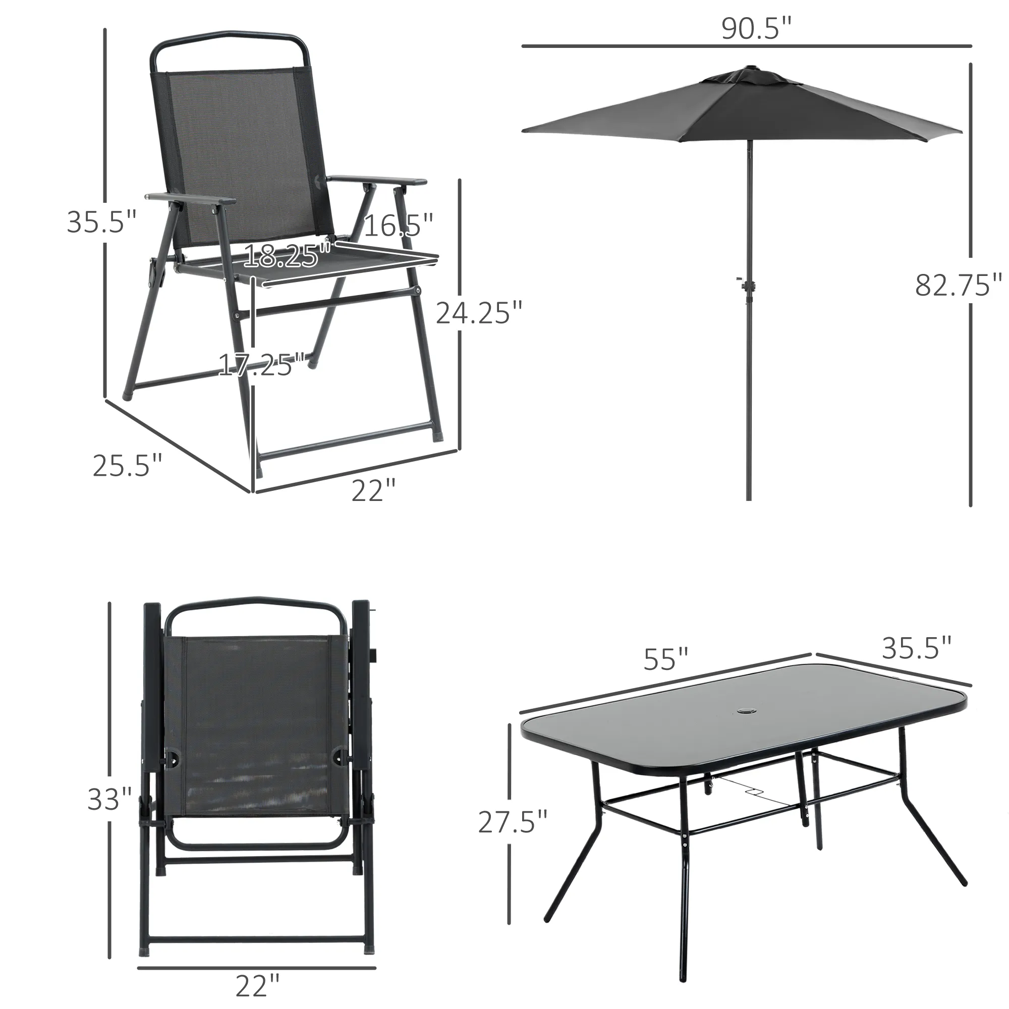 Patio dining set with table, chairs, and umbrella. Perfect for outdoor dining, chatting, games, and relaxation. Patio Set with Umbrella: Outdoor dining set with a complete umbrella for shade and aesthetic appeal. Enhance your outdoor dining experience. Folding Chairs: Outdoor dining chairs with breathable mesh seats and folding steel frames for easy transport and storage. Patio Table: Easy-to-clean dining table with a 5mm thick tempered glass top. Ideal for meals, drinks, and games with friends.