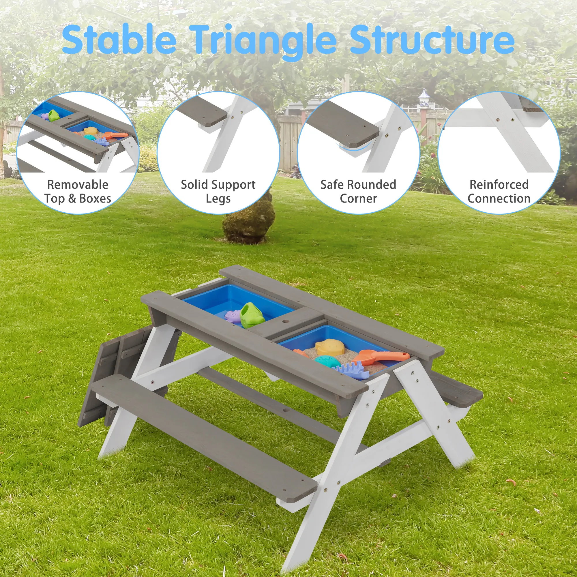 Natural Cedar Wood: Made from sturdy and anti-corrosion natural cedar for long-term use. 3-in-1 Design: Multifunctional table can be used as a picnic table, activity table, sand table, or water table with sink toys. Adjustable Umbrella: Umbrella can be adjusted to protect kids from sunlight, removed, and folded for storage. Water-Based Coating: Kids-friendly water-based coating for a better playing experience.