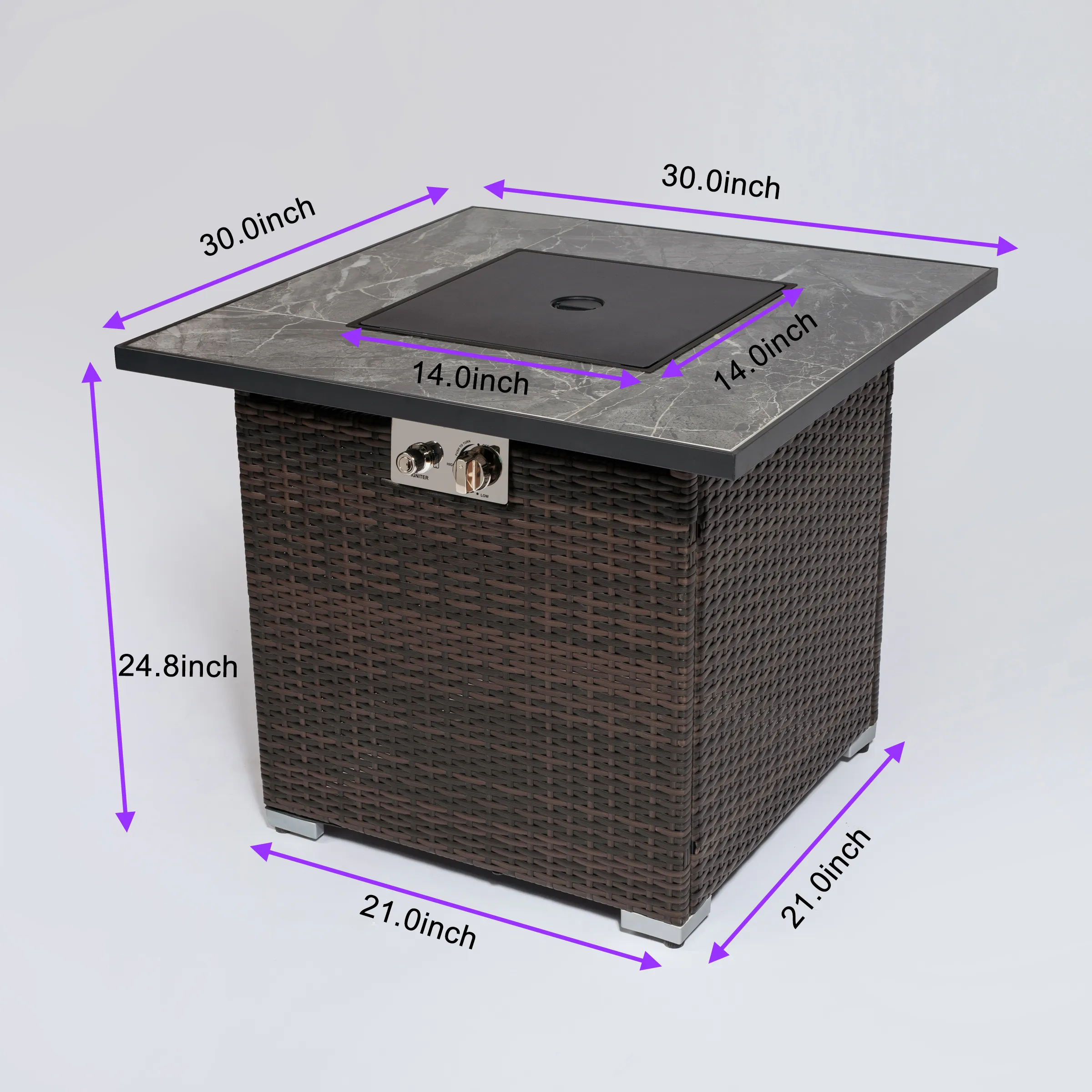 30inch Outdoor Fire Table Propane Gas Fire Pit Table with Lid Gas Fire Pit Table with Glass Rocks an Notice NOT Suitable for Natural Gas! Dark Brown Wicker Body Ceramic Tile Tabletop Steel Frame ETL Approved Stainless Steel Burner, With Electronic Pulse Igniter Fuel: Propane / Liquefied Petroleum Gas Area Heated:11 Sq.Ft Bowl Depth: 2.2inch Housing Material: Steel + PE Rattan (or Wicker) Tabletop Material: Ceramic Tile (or Marble Tile) Flame Adjustable: Yes Steel Lid: Included Heat output: 40000BTU Rain Cover: Included Rocks: Included (with mixed color glass rocks) Gas Regulator with Hose: Included Glass Windshield (Guard): Not Included LNG(Natural gas): No Support