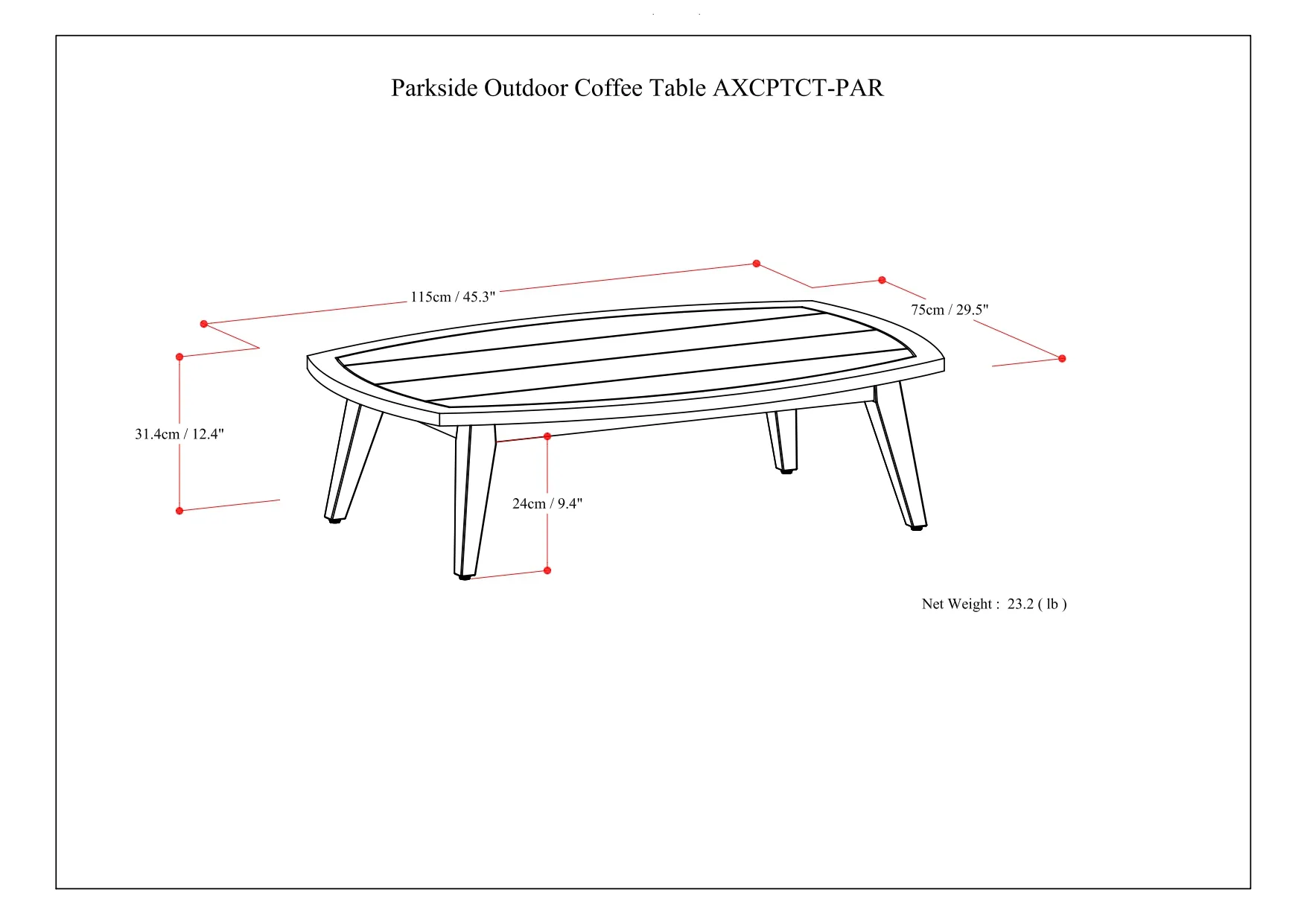 • Features large, thick slatted table top and four (4)sturdy angled table legs with levelers