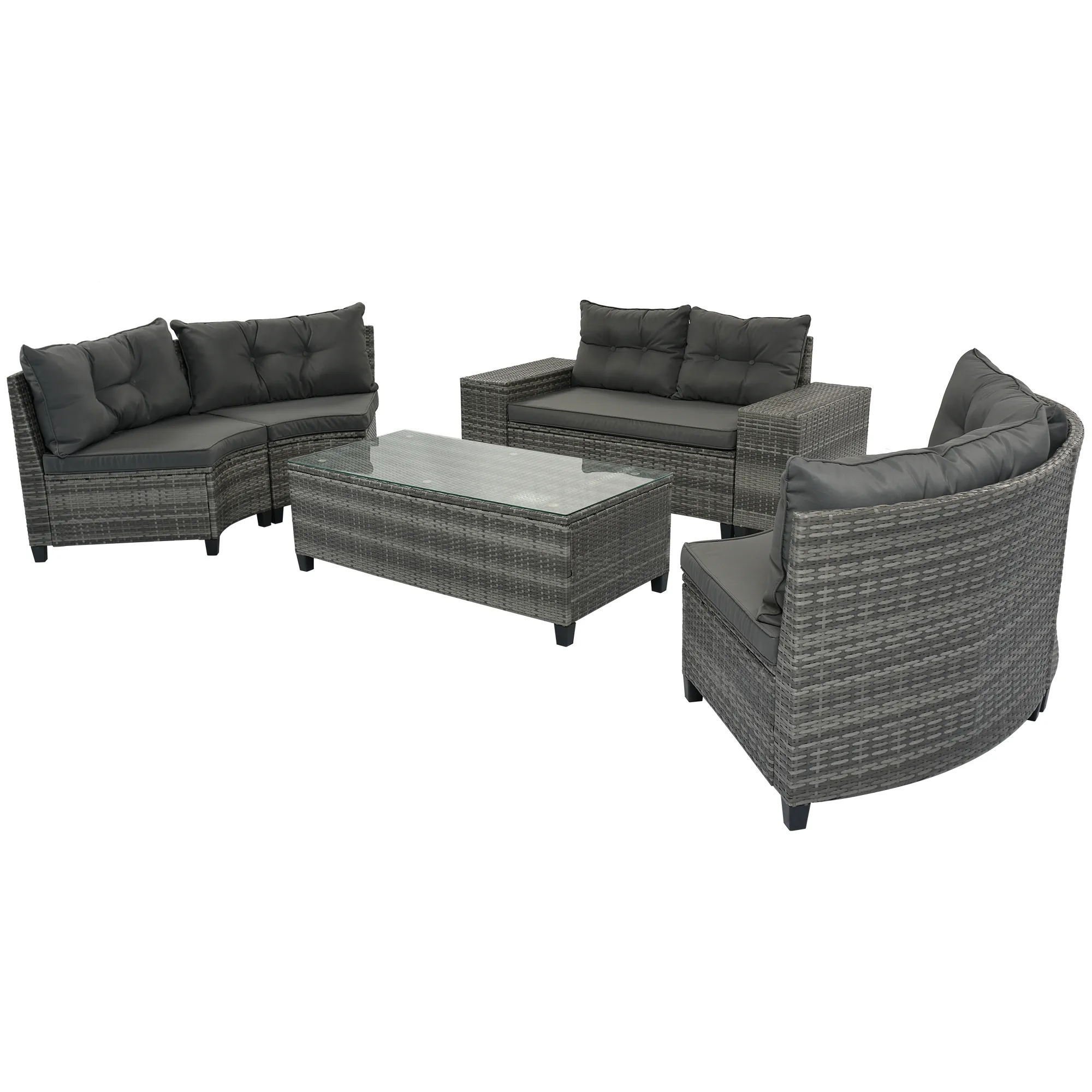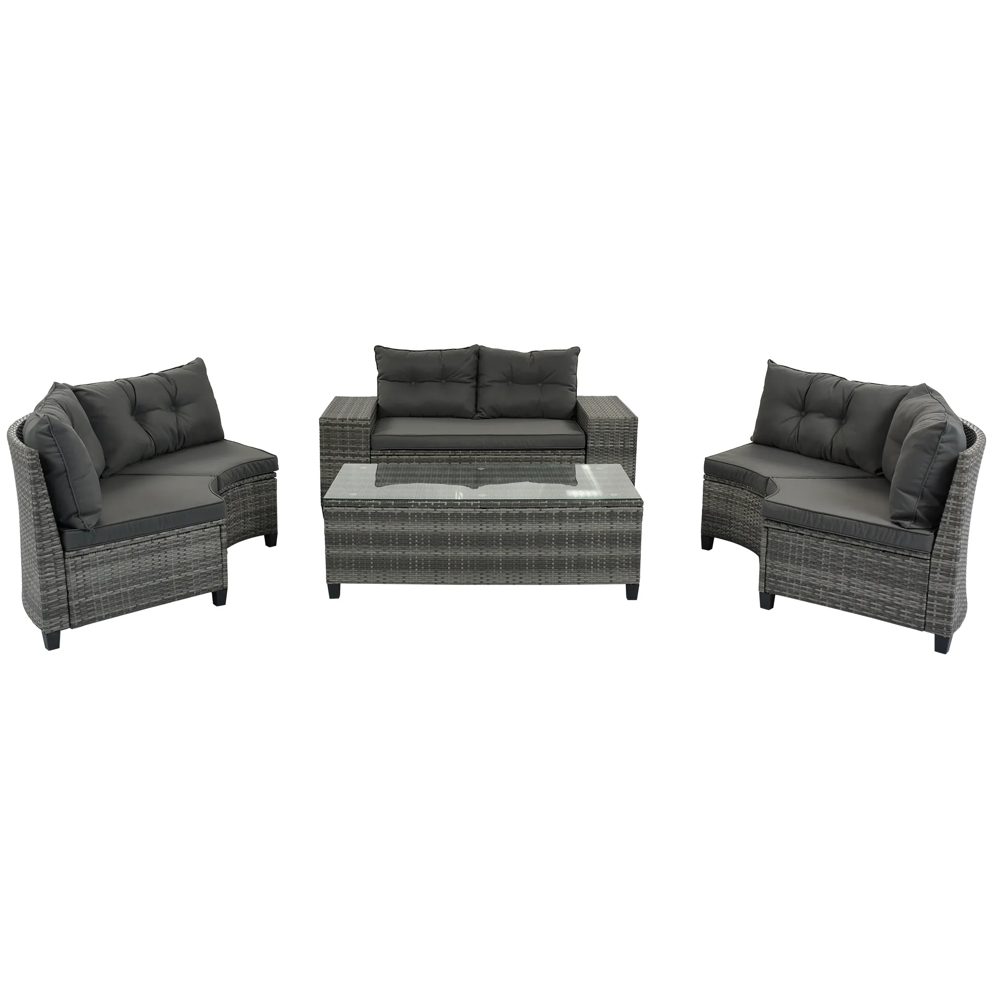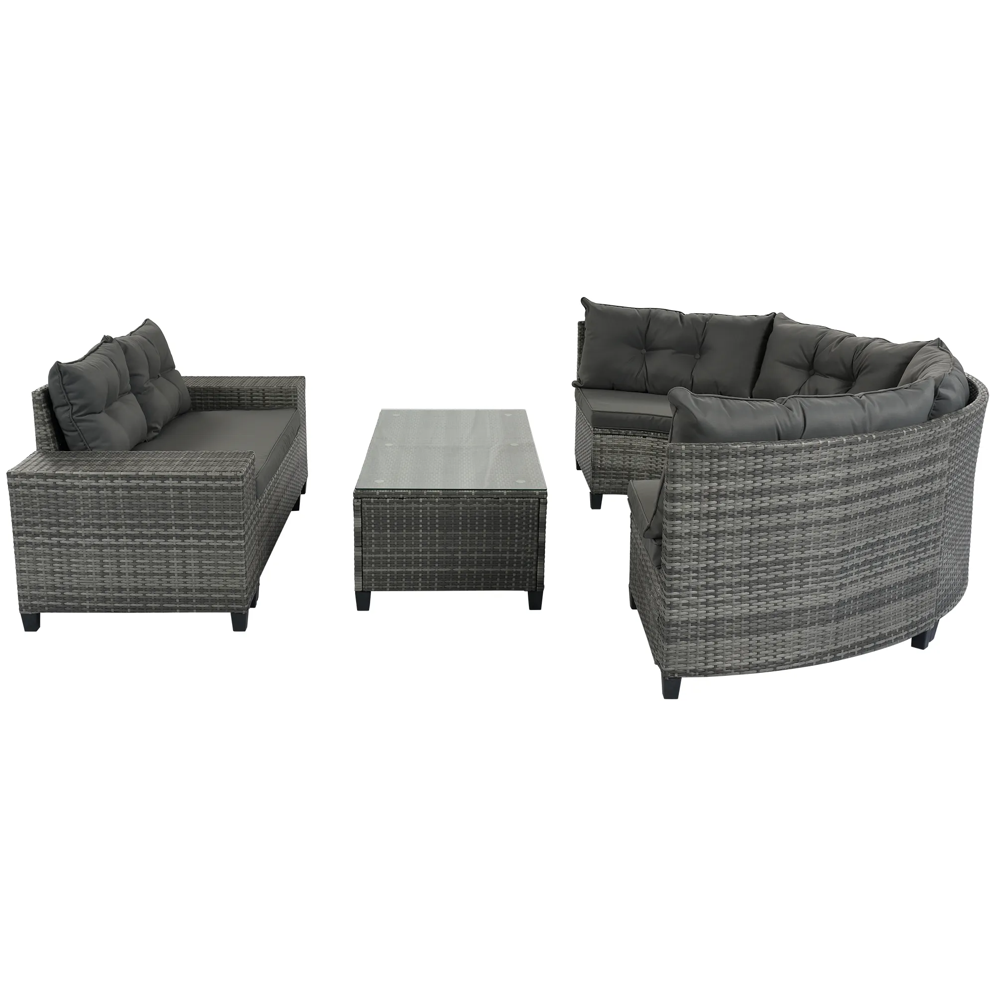 Simple Cleaning: Cushions made of waterproof, UV-proof, and corrosion-proof fabric for easy maintenance. Tempered glass table top connected securely with suction cups. Easy to clean with just a rag. Variable Placement: Offers versatile placement options like semi-oval shape for intimate conversations and arc shape for formal settings. Suitable for various spaces and activities. Best for Outdoor Living: Smooth and natural arrangement of arc sofas for intimate gatherings. Comes in elegant gray and fresh beige colors to complement any style. Detailed Tutorial: Includes a detailed installation tutorial for easy assembly by 1-2 adults in about 1 hour. Carefully packed in 4 flat packages for safe shipping. Patience required as packages may arrive separately.