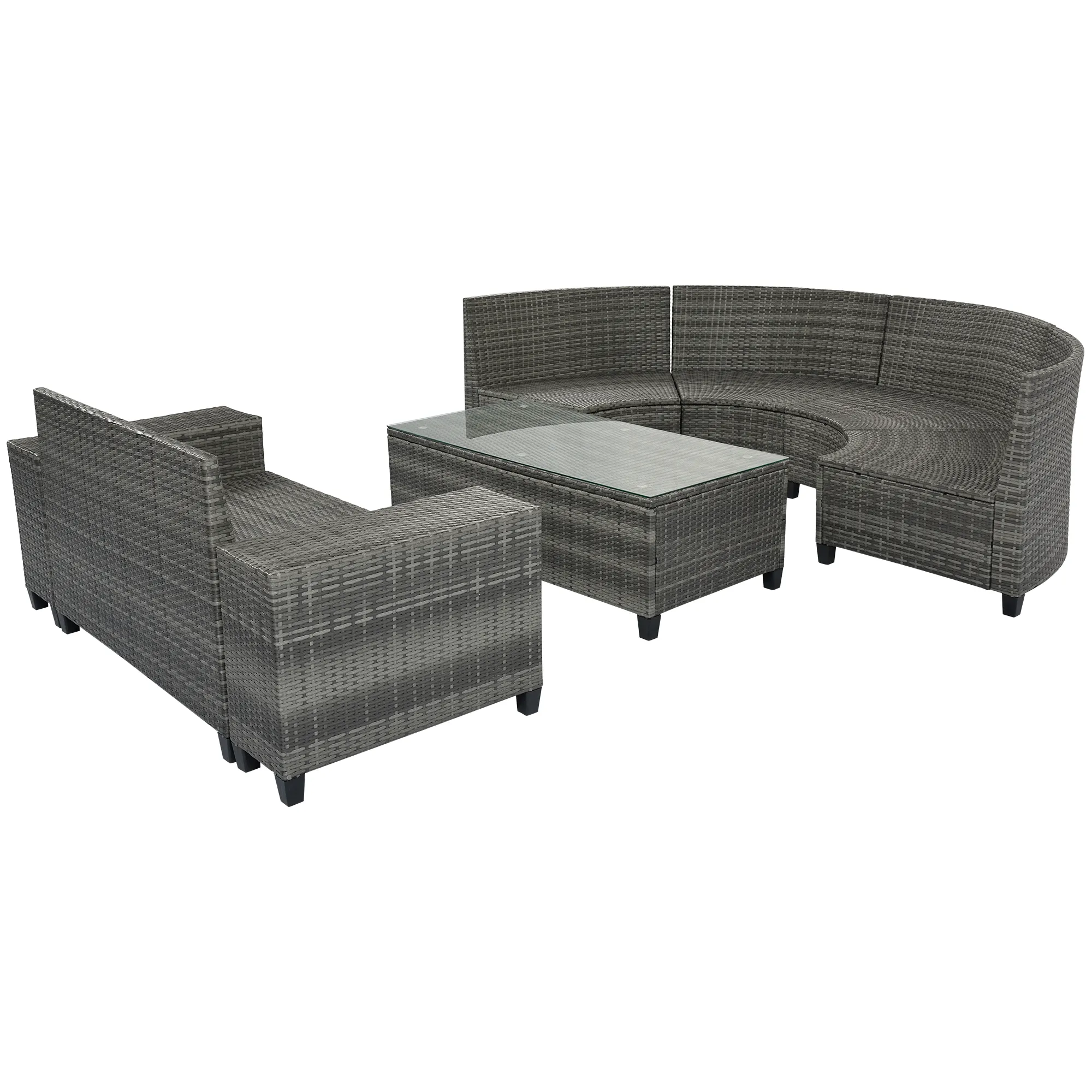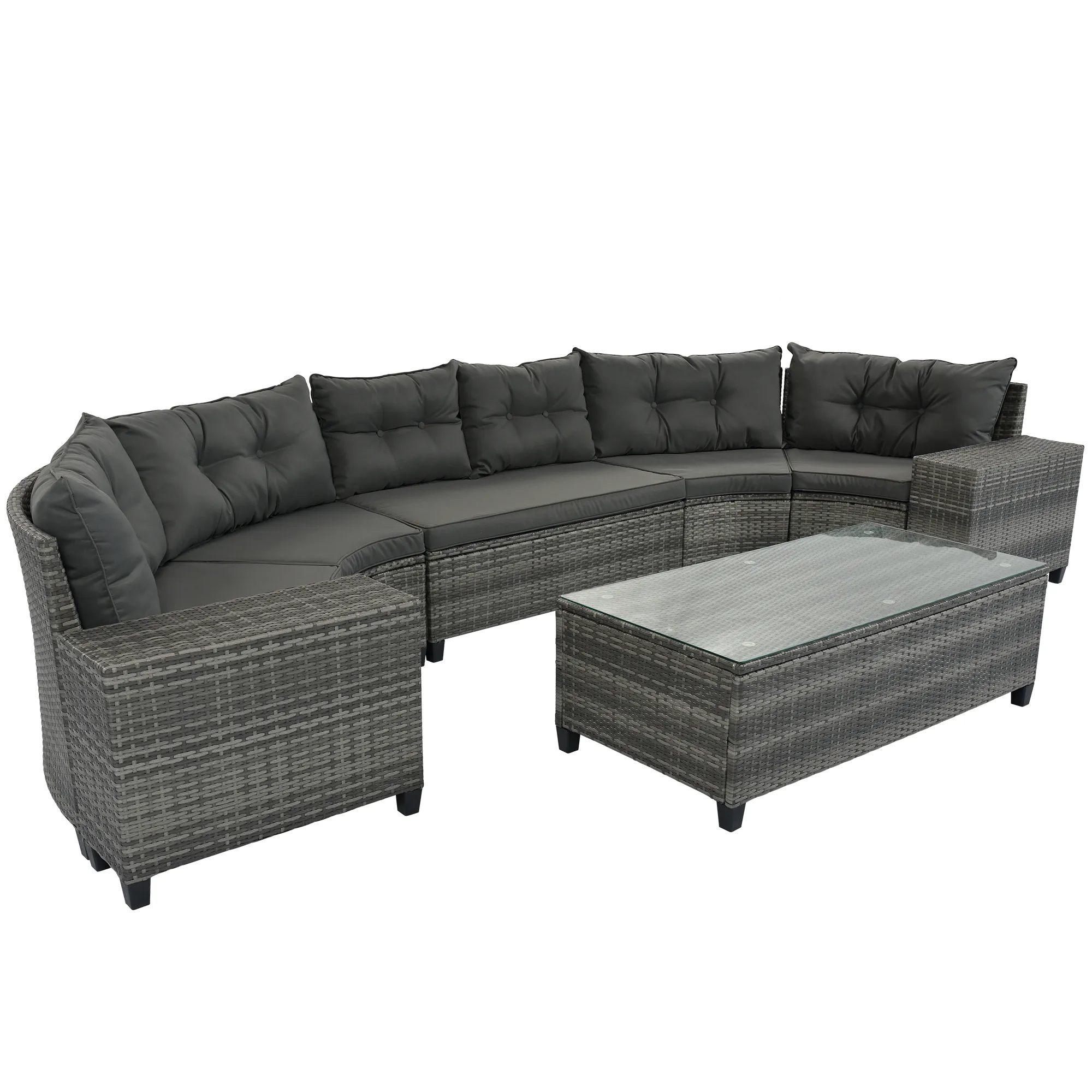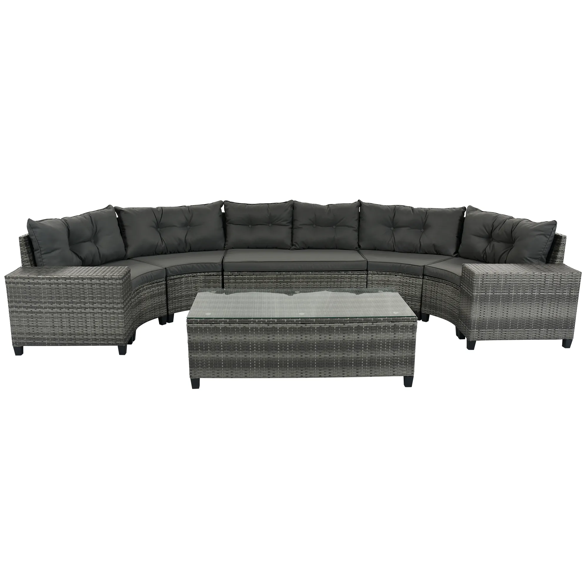 8 Pieces Outdoor Wicker Round Sofa Set, Half-Moon Sectional Sets All Weather, Curved Sofa Set With Rectangular Coffee Table, PE Rattan Water-Resistant And UV Protected, Movable Cushion - Gray