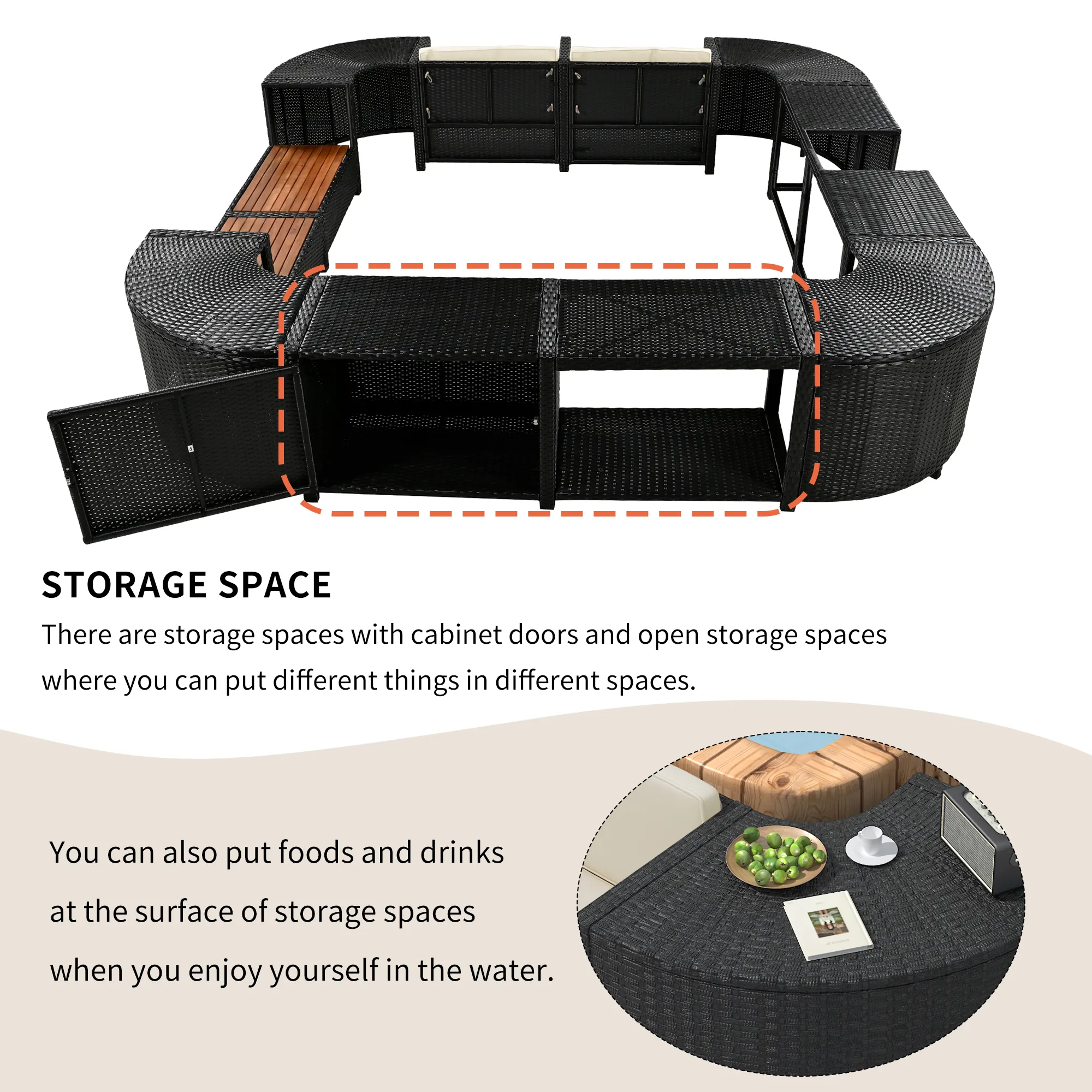 Versatile and Chic Design: Enhance your spa area with a modern and chic spa surround suitable for portable spas. Durable and Waterproof: Made of rattan and steel, this sofa set is durable and the cushions are waterproof for long-lasting use. User-friendly Features: Enjoy organized storage with built-in storage areas for easy access to spa essentials. Comfortable Seating Options: Relax with a wooden seat or soft cushion that can be easily removed for your convenience. Ample Storage Space: Stay organized with various storage options including cabinet doors and open spaces, perfect for storing different items and even placing snacks while enjoying your spa.