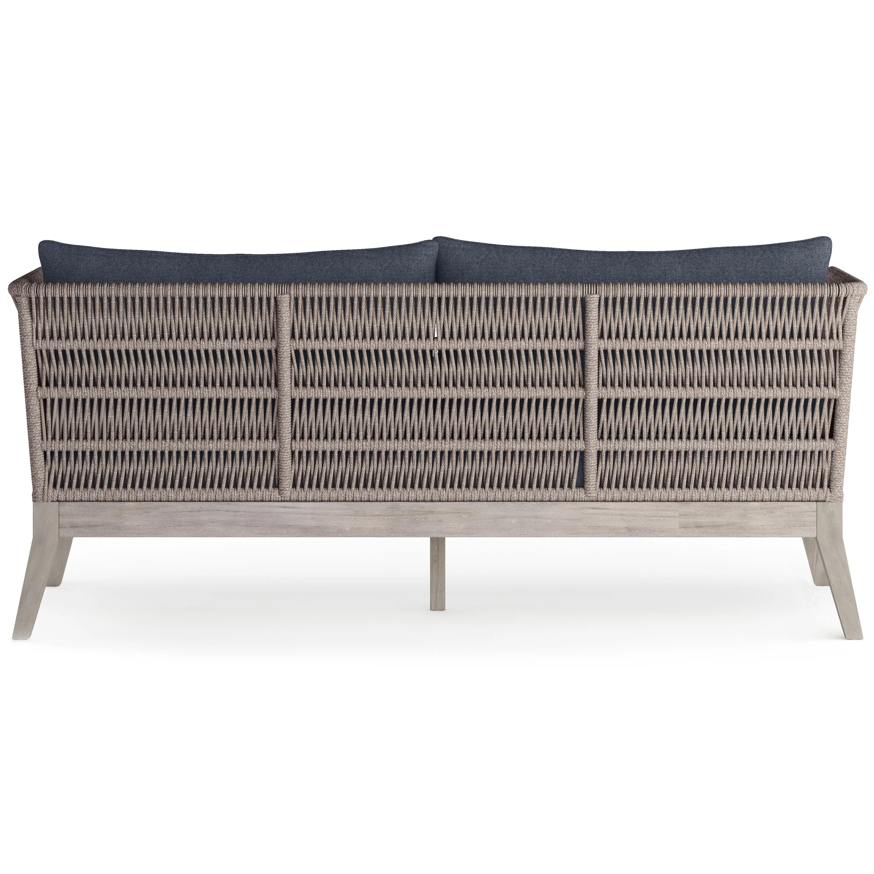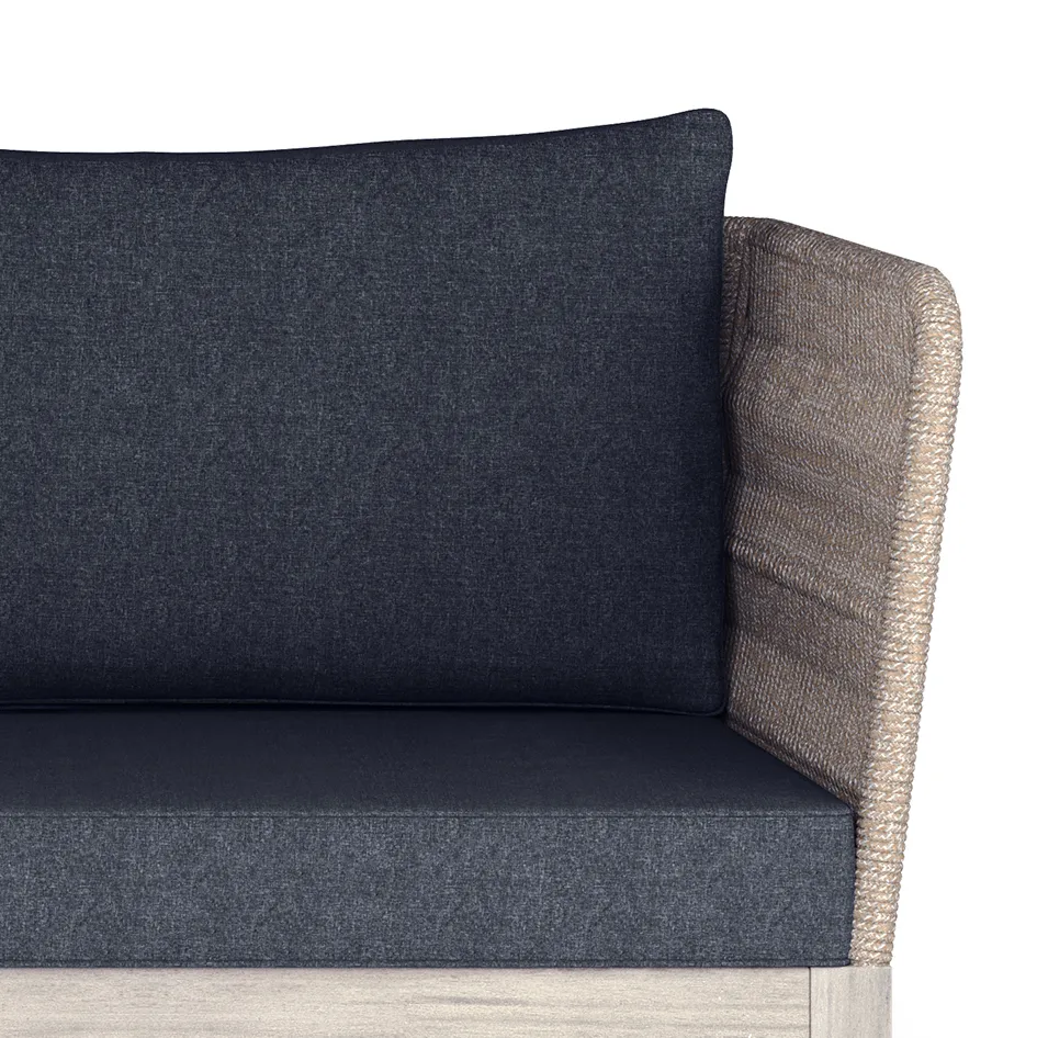 Capable of completing our Santiago Outdoor Conversation set or standing out on its own, the alluring look of the Santiago sofa will be a standout addition to your outdoor patio or backyard area. This sofa is designed with a unique feature where the frame of the back and arms are wrapped with highly durable woven rope in an intricate pattern. The sofa base and legs are built with solid acacia wood. Covering the thick, comfortable cushions is premium water repellent fabric. Paired with the coffee table and chairs the Santiago Outdoor Conversation Set will add a completely new dimension to your outdoor furniture