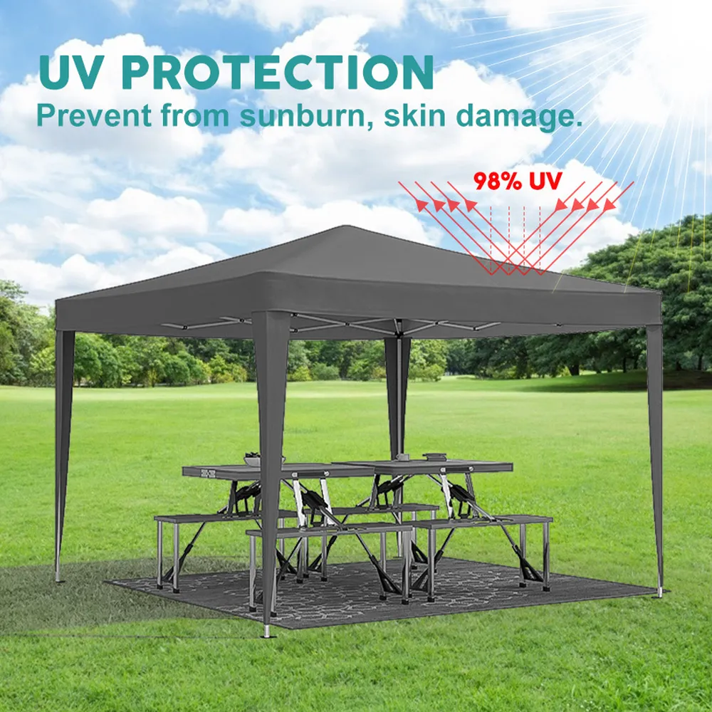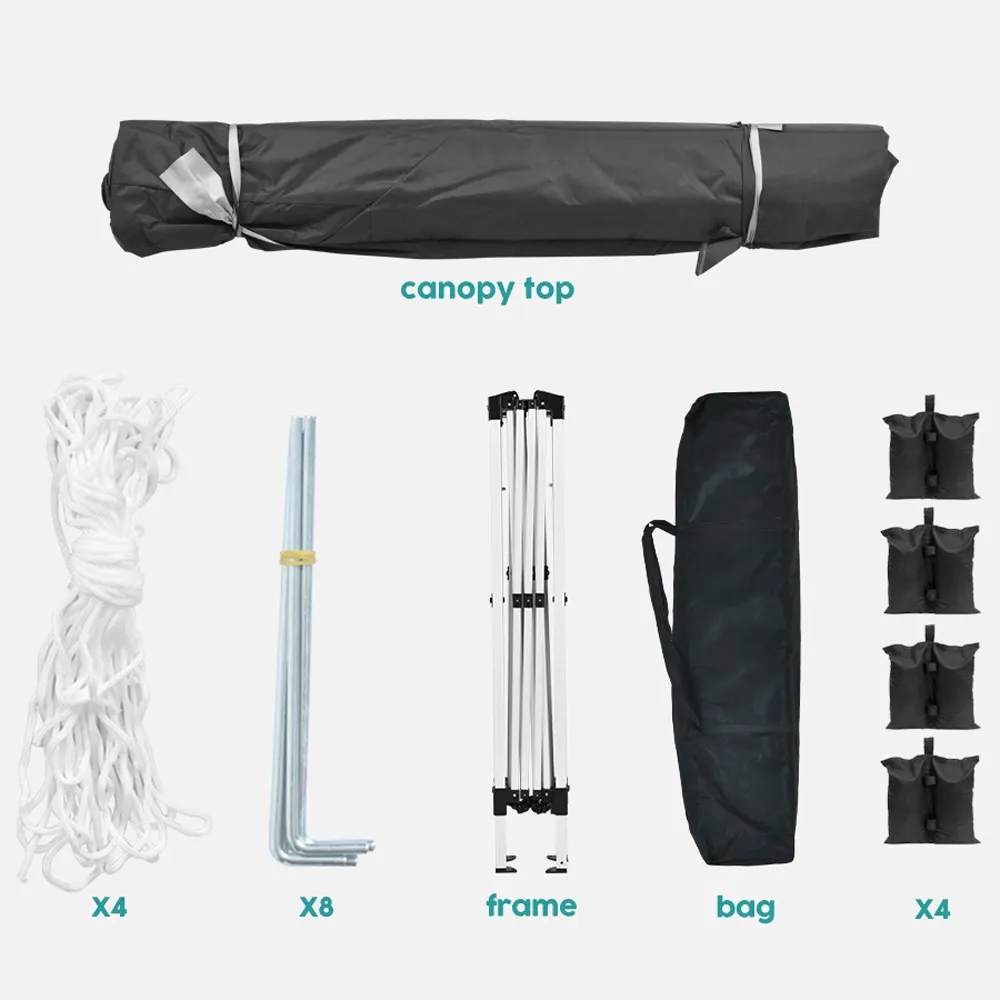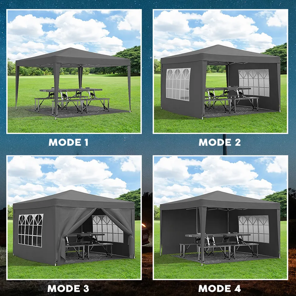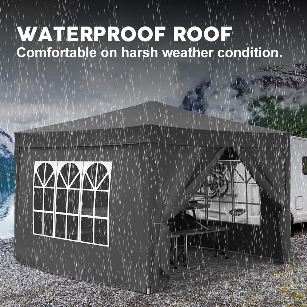 High Quality: Made of waterproof Oxford fabric with PU coating, blocks 99% of sun's rays. Includes 4 sandbags, ground nails, and wind ropes for enhanced stability. Practical Design: Features 4 removable sidewalls with windows and 2 with zippers, allowing adjustments for different weather conditions and event types. Widely Used: Ideal for various outdoor occasions like family reunions, parties, beach gatherings, garden events, competitions, and small businesses. Easy Setup: Can be set up in a few minutes by 2-3 people without tools. Comes with a travel-friendly carrying bag for easy storage and transport.